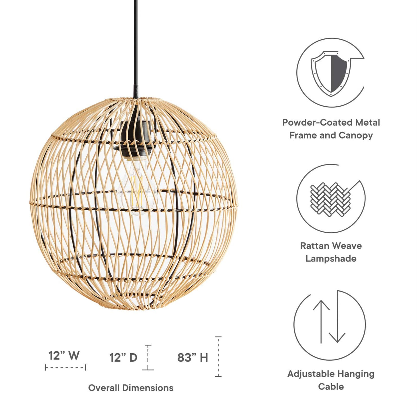 Energize your home lighting design with the bohemian-inspired Nurture Rattan Pendant Light, blending rustic craftsmanship with industrial chic. This modern farmhouse style ceiling light fixture features an open rattan weave on a black iron frame with a matching round ceiling canopy and adjustable length hanging cable; an eye-catching accent light in mid-century modern or eclectic decors. The wire-cage design of this hanging light fixture creates a vibrant, welcoming focal point in your entryway, living room, or above a kitchen island. The Nurture Pendant Light takes 1 E26 60W max bulb or LED equivalent (not included). Compatible with dimmer switches (not included). Professional installation is required.Features:Material: Rattan, ironFinish: Natural, blackRattan weaveWire-cage designBlack iron frameProfessional installation requiredBulbs: 1 E26 60W Max (Not Included)Dimmable (switch not included)LED compatibleSpecifications:Product Dimensions: 83.5"H x 12"W x 12"DProduct Weight: 2 lbs