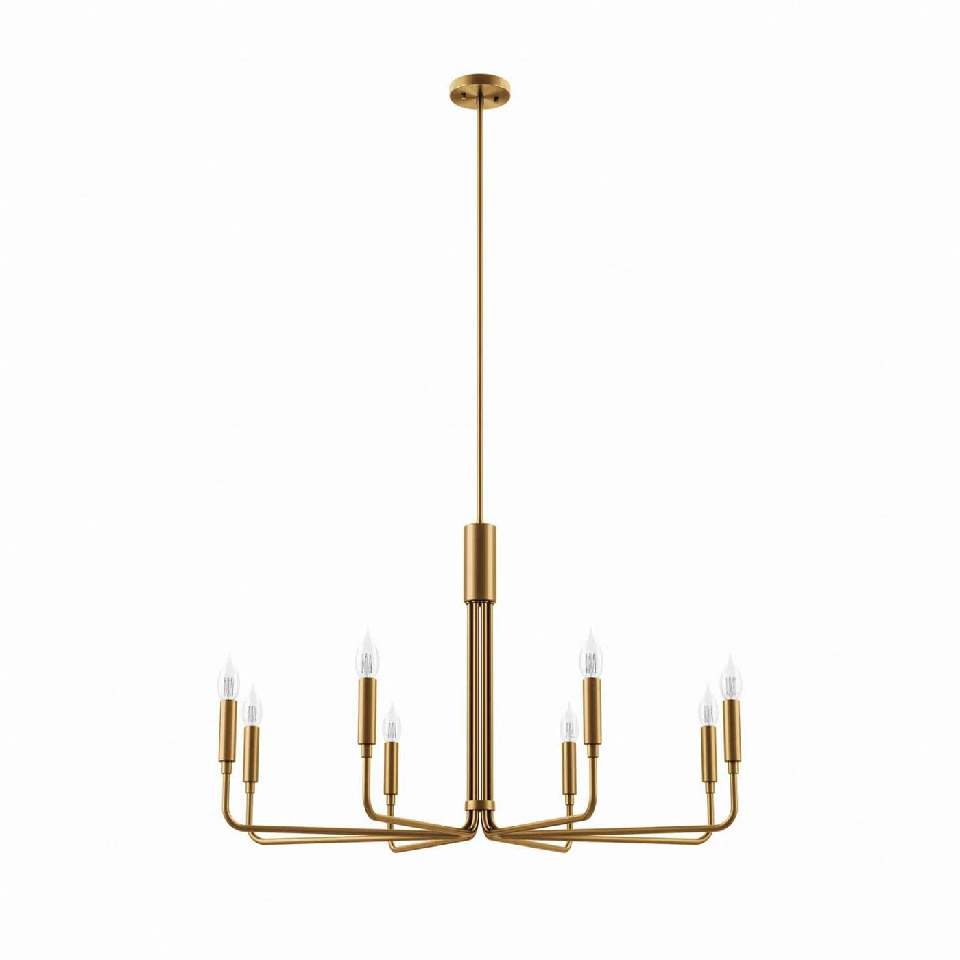 Illuminate your living space with the artful elegance of the Rekindle 8-Light Chandelier that complements a variety of decors from mid-century modern to minimalist contemporary. A timeless piece for your living room, dining room, entryway, or office space, this chandelier light features eight sleek arms that extend out from a cylindrical centerpiece with ceramic lamp holders to host exposed light bulbs. Compatible with sloped ceilings, Rekindle has a ceiling canopy with a swivel adaptor and features a five piece, height-adjustable hanging rod to suit a range of ceiling heights. The Rekindle Light Fixture is ETL listed for damp locations and requires eight E12 light bulbs 60W max or LED equivalent (not included). Luminaires that are “Suitable for Damp Locations” are approved for areas that are regularly exposed to moisture and condensation. Professional installation required. Set Includes: One - Rekindle 8-Light Chandelier Product Dimensions: Overall Product Dimensions: 25"L x 47.5"W x 77.5"H Base Dimensions: 5"L x 5"W