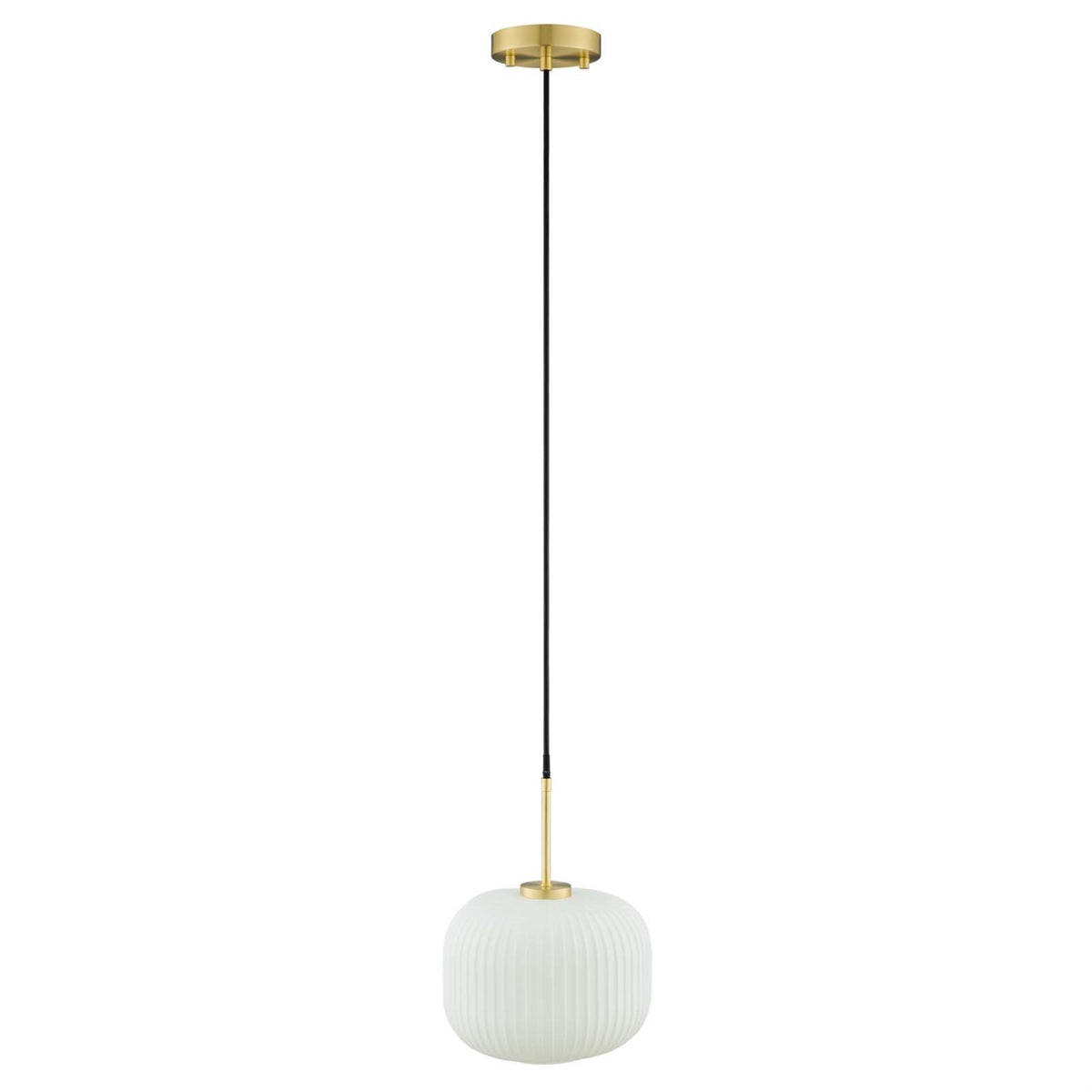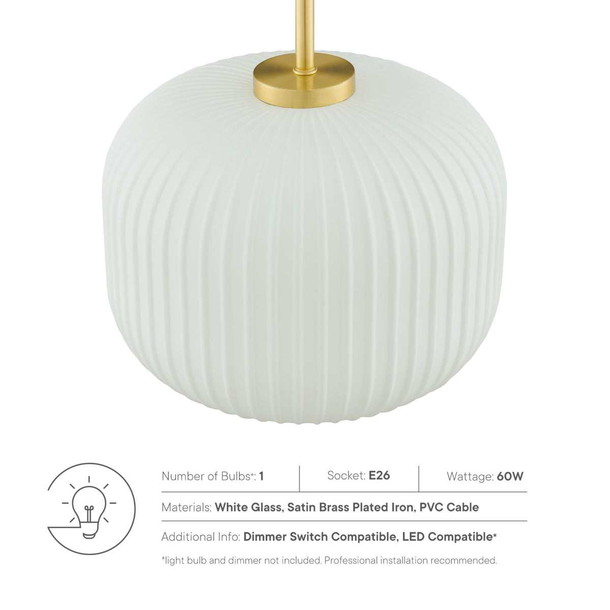 Introduce design ingenuity and nuanced retro style into your home lighting scheme. The iconically shaped Reprise Glass Pendant Light brings structure, texture, and a warm transparent glow in your bedroom, living room, dining room, kitchen, or entryway. The opaque glass shade is softly textured with embossed horizontal lines creating a commanding ceiling light fixture in mid-century modern, contemporary, or eclectic decors. This height-adjustable hanging pendant is an ideal kitchen island light with rich satin brass accents, an open base allowing easy bulb access, and a height-adjustable black hanging cable. Reprise is a dimmable hanging light, an eye-catching focal point above your dining table (dimmer switch not included). Requires 1 E26 60W max bulb or LED equivalent (not included). Professional installation required. Clean with a soft, damp cloth.Features:Material: Glass, metalFinish: White, satin brassPendant lightProfessional installation requiredBulb: 1 E26 60W Max (Not Included)Dimmable (switch not included)LED compatibleSpecifications:Product Dimensions: 84"H x 10"W x 10"DProduct Weight: 4 lbs