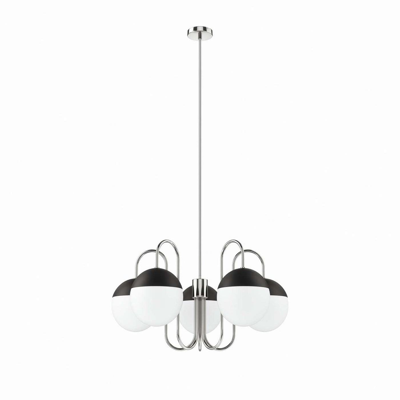 Cast a warm, ambient glow around your home or apartment with the Stellar 5-Light Chandelier. Adding contemporary charm to an entryway, kitchen, dining room, bedroom, office, or other living space, this spherical light fixture features frosted glass shades that attach to matte black metal bases. Compatible with sloped ceilings, Stellar has a ceiling canopy with a swivel adaptor and features a five piece, height-adjustable hanging rod to suit a range of ceiling heights. This ceiling pendant requires five E26 bulbs 60W max or LED equivalent (not included). UL Listed for Damp Locations. Luminaires that are “Suitable for Damp Locations” are approved for areas that are regularly exposed to moisture and condensation like the bathroom. Professional installation required. Set Includes: One - Stellar 5-Light Chandelier Product Dimensions: Overall Product Dimensions: 28.5"L x 28.5"W x 71"H Shade Dimensions: 7"W x 7"H Base Dimensions: 5"L x 5"W