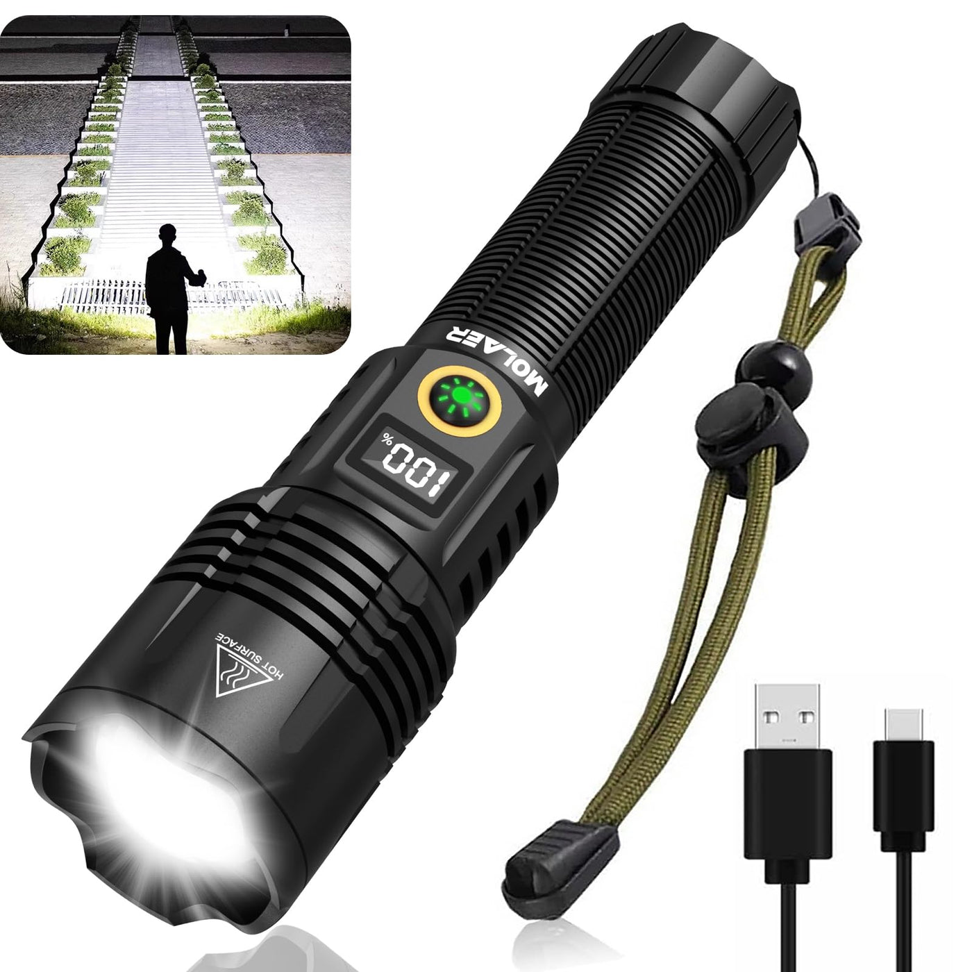Molaer Rechargeable Flashlights High Lumens, Super Bright Led Flashlight With Zoomable, 6 Modes, Ipx6 Waterproof, Powerful Tactical Handheld Flash Light For Camping, Hiking, Emergencies.?Super Bright High Lumens Flashlight?The Newly Rechargeable Flashlight Is Equipped With A Upgraded Chip, Offering A 30% Performance Improvement. The Flashlight Has An Astonishing Output Power Of Up To 2200 High Lumens, Which Is 20 Times Brighter Than A Regular Led Flashlight. The Brightness Is Comparable To That Of A Car Headlight, So Please Avoid Direct Eye Exposure.?Lcd Power Display? Powerful Flashlight Uses A Digital Screen To Display The Remaining Power, Allowing Us To Accurately Monitor The Power Status Of The Powerful Flashlight In Real Time. And It Is More Accurate And Convenient Than The Usual Power Display.?Fast Charging & Large Capacity? Our Led Flashlight Is Equipped With A 5000Mah High-Capacity Rechargeable Battery, Providing Up To 36 Hours Of Continuous Runtime On Low Mode. The Flashlight Is Equipped With A Usb-C Smart Charging Interface And Can Be Fully Charged In Just 3 Hours. What'S More, The Usb Output Port Also Serves As A Backup Power Source In Emergency Situations, Enabling You To Charge Your Phone Or Other Devices While On Your Adventurous Journeys.?6 Light Modes & Variable Zoom? This High Lumen Rechargeable Flashlights Has 6 Lighting Modes, Click The Button: High-Medium-Low-Moonlight Mode, Double-Click The Button To Enter: Strobe-Sos Mode. In Any Mode, We Can Turn Off The Led Flashlight By Pressing And Holding The Button For 2 Seconds. According To Our Needs, We Can Stretch The Head Of The Handheld Flashlight To Adjust The Focus, Freely Choosing Long-Distance Observation And Wide-Area Lighting. ?Ipx6 Waterproof & Drop Protection? Our Waterproof Flashlights Feature Advanced Sealing Technology That Keeps Them Water-Resistant, You Can Boldly Navigate Through Rain, Storms, And Any Challenging Weather Conditions.