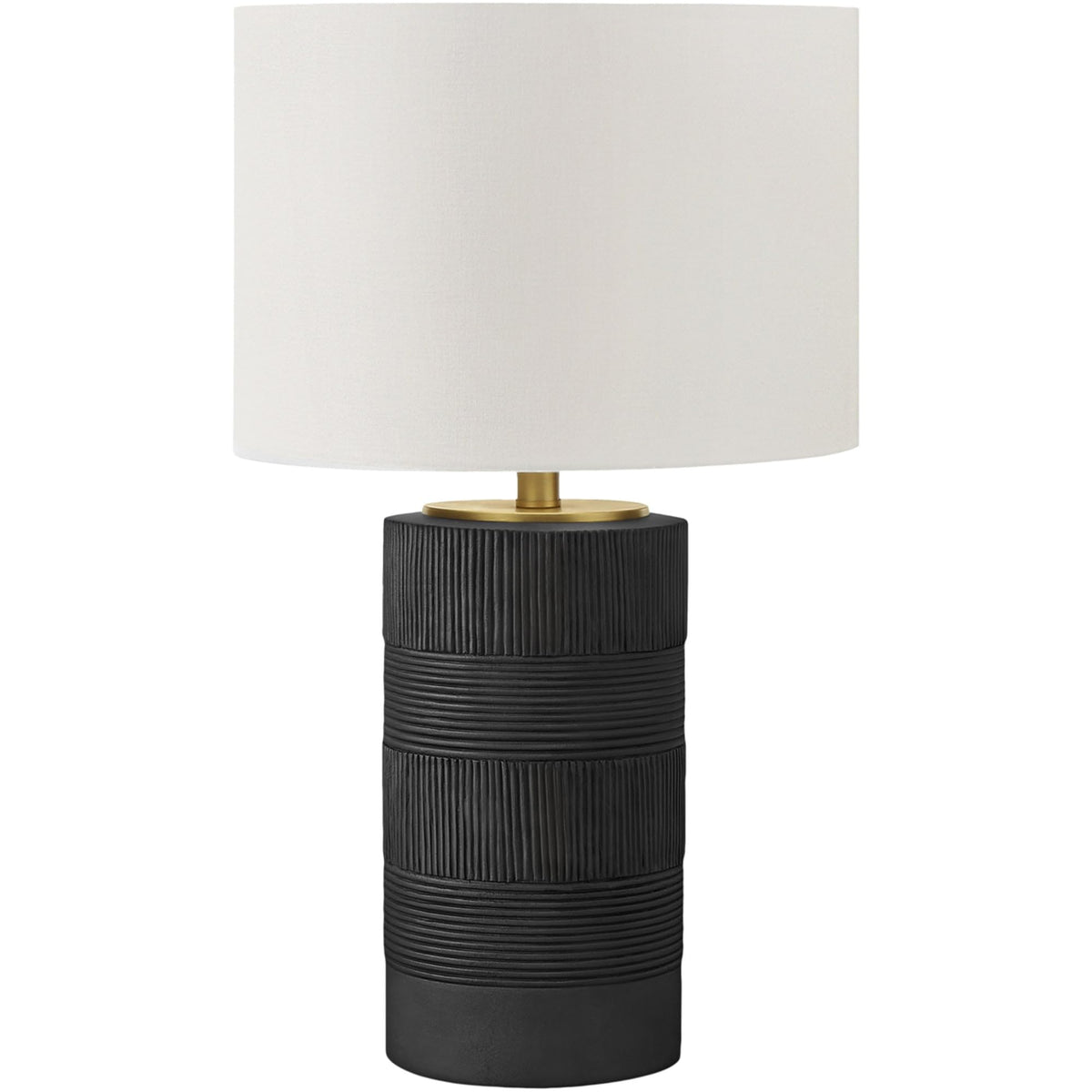 Bring a stylish and modern look to any room in your home with this 24"h table lamp crafted in black resin with an elegant ivory shade, and finished with a simple, round gold finial on top. The perfect size for side or end tables, and nightstands, this decorative accent lamp will bring a sophisticated tone to a room. Featuring a 3-way light switch that holds a single bulb with a maximum outage of 100W/120V (not included), and a textured finish base, this cylinder shaped, contemporary styled lamp will help to create the right lighting ambiance in your home office, living room, or bedroom. Designed using durable materials, this accent lamp includes a 2 year limited warranty against any manufacturer s defects for a worry-free purchase.
