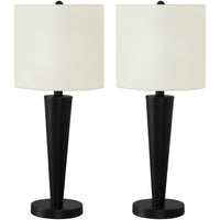 Create a polished contemporary ambiance in your home with this set of 2, 24"h table lamps. The sleek tapered black metal frame over a round metal base, topped with an ivory linen fabric shade and finished with a round black metal finial, makes these versatile lamps perfect to illuminate your office, living room, or bedroom. Each accent lamp is equipped with a rotary switch on the base for easy on and off access, and a USB port included for charging your favorite devices. Using a single bulb (not included) for a maximum output of 60W/120V and attached with a 6ft black cord, this set of lamps provide a practical lighting solution when placed on your end or side table, console table, nightstand or bedside table. Made with quality materials, this set includes a 2 year limited warranty against any manufacturer s defects for a worry-free purchase.