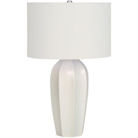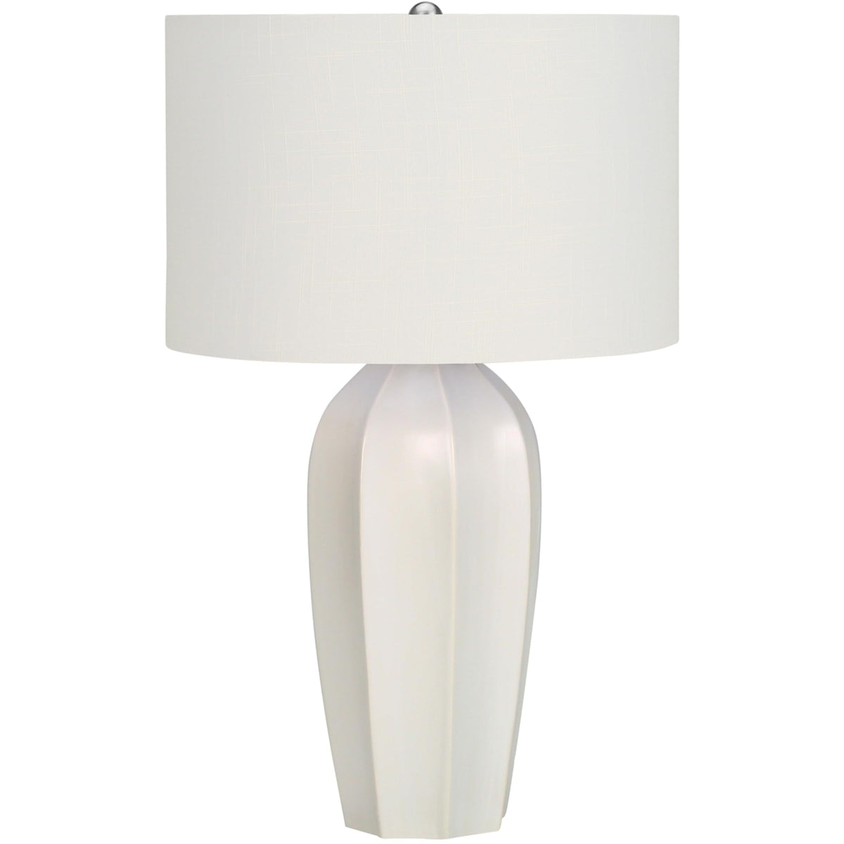 Bring some contemporary sophistication to any room with this stylish 27"h table lamp. A beautiful blend of art-deco with a modern edge, the smooth cream ceramic base in a tapered vase shape, is complimented with an elegant ivory linen drum shade, and finished with a silver metal finial on top. With a 3-way switch that houses a single bulb (not included) for a maximum output of 100W/120V, this lamp offers three levels of illuminating light for creating the ambiance you desire. Attached with a 5ft transparent cord, this is the perfect functional accent to place on an end or side table in a livingroom or home office, or bring it into your bedroom to set on a nightstand or bedside table. Made with high quality materials, this lamp includes a 2 year limited warranty against any manufacturer s defects for a worry-free purchase.