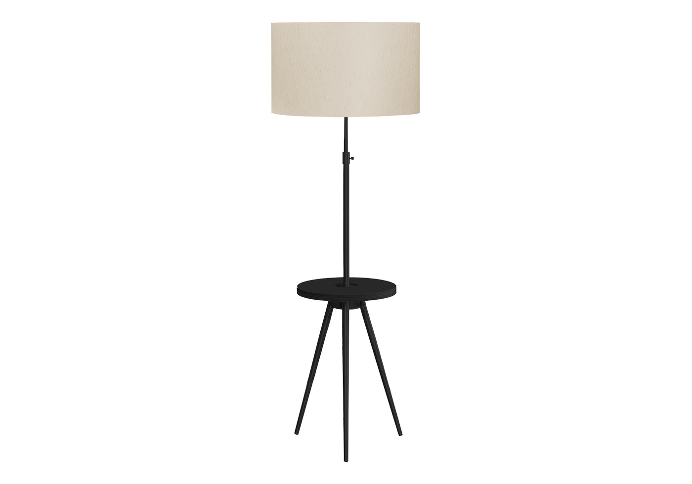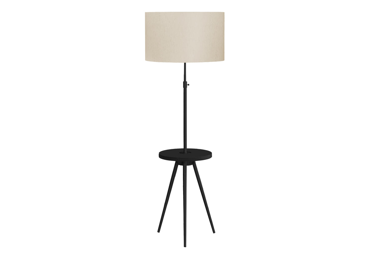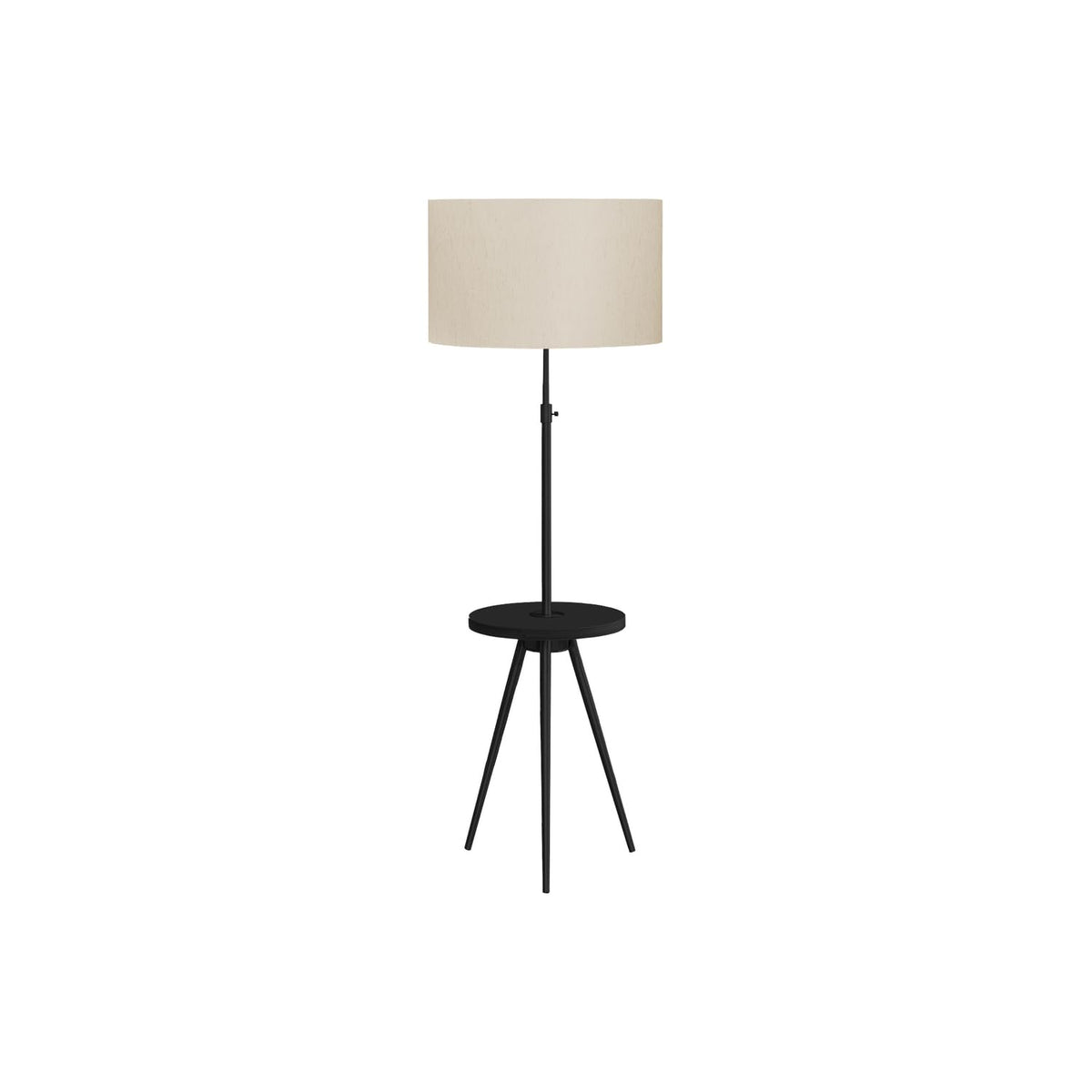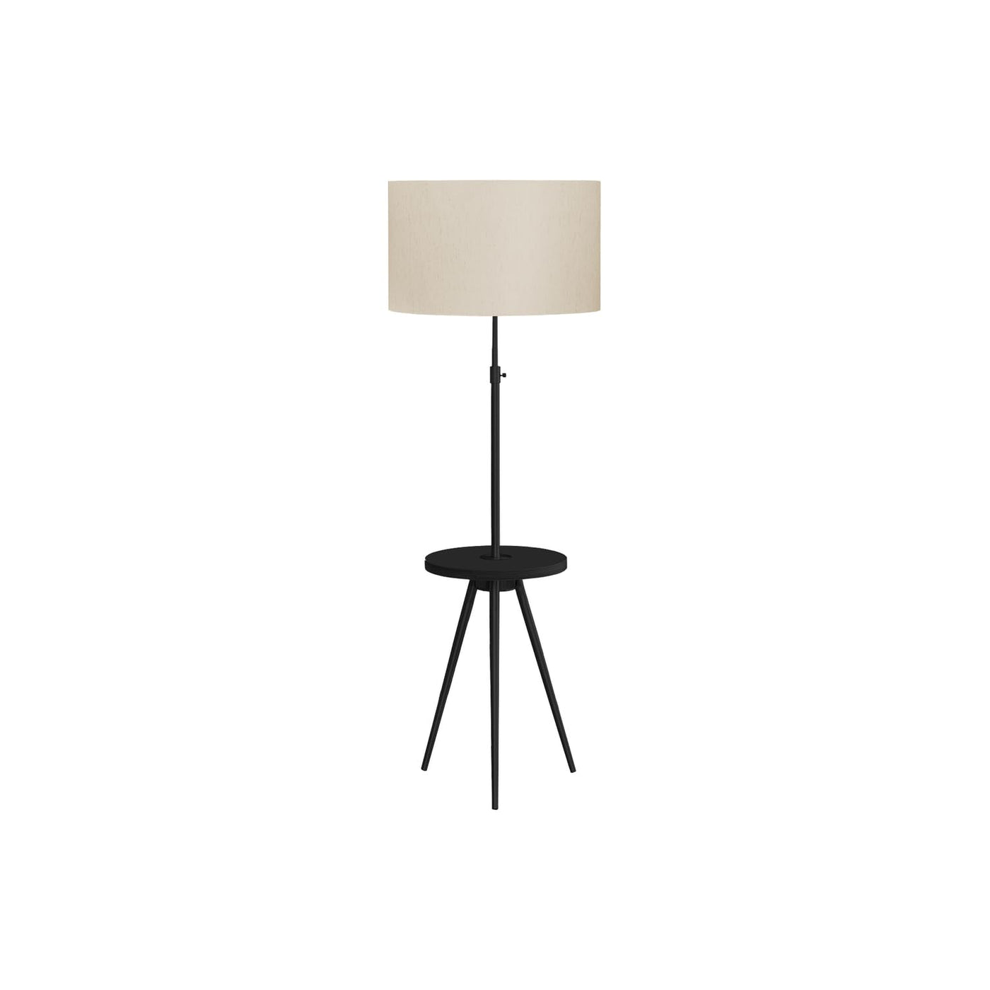 Up your style game with this sleek 66"h tripod floor lamp. The contemporary design features a black metal tripod design with an adjustable neck that can be lowered or raised to your desired height, adding a modern touch to any room. The linen ivory fabric shade diffuses the light beautifully, creating a warm and inviting ambiance. The handy, built-in round shelf table finished in a smooth black laminate is convenient to put down your phone or a drink. The rotary 3-way switch can house a standard tri-bulb (not included) for a maximum output of 150W, allowing you to customize the lighting to dim or illuminate a living room, bedroom, or office. Only minor assembly is needed to quickly setup and use this beautiful accent lighting piece, which also comes with a 2 year limited warranty against any defects for your comfort. Whether you need to brighten up a dark corner or add decorative flair to your space, this floor lamp is the perfect addition!