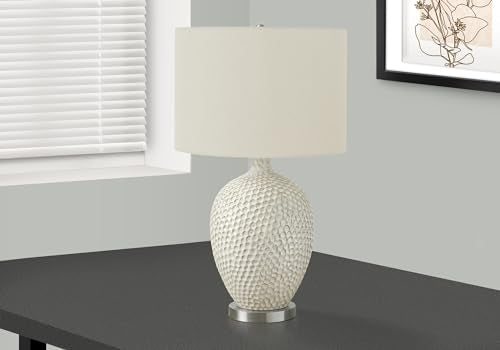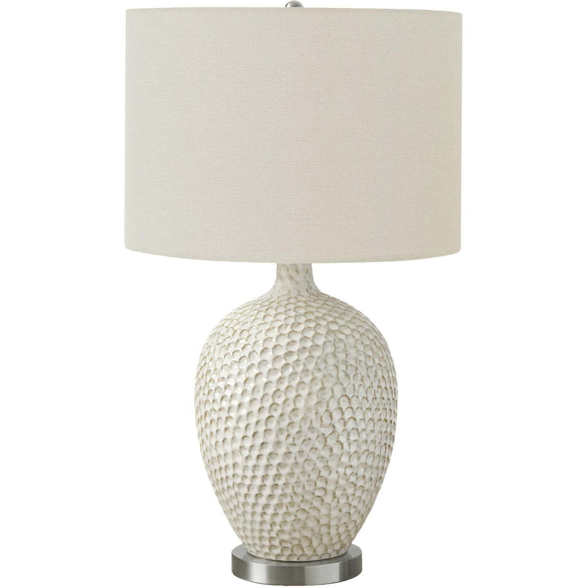 Are you ready to try something new? How about upgrading your home with this stylish and trendy 28"h table lamp! Showcasing a textured cream ceramic vase shaped silhouette, mounted on a round silver metal base and topped with an ivory linen fabric shade, this contemporary style lamp will brighten any end or side table, console, a nightstand or bedside table. The convenient 3-way switch holds a single bulb for a maximum output of 100W/120V (not included), making it easy to adjust the lighting and create the perfect ambiance in your livingroom, bedroom, or home office. Backed with a 2 year limited warranty against any defects, add this fashionable accent to any space for a quick and practical upgrade.