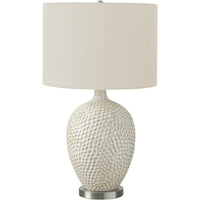 Q: What material is the lamp made of?A: The lamp features a textured cream ceramic body, complemented by an ivory linen shade, providing both style and durability.