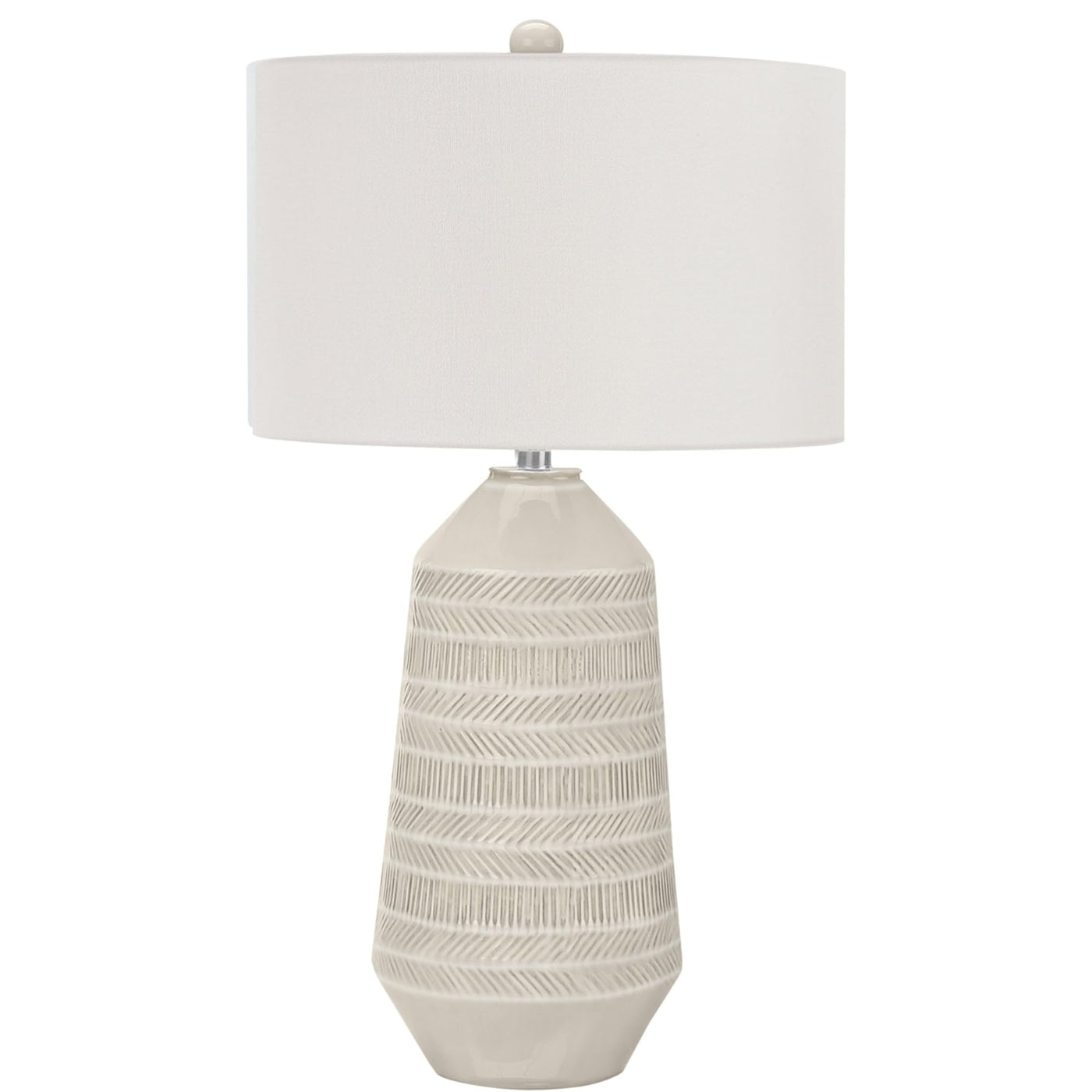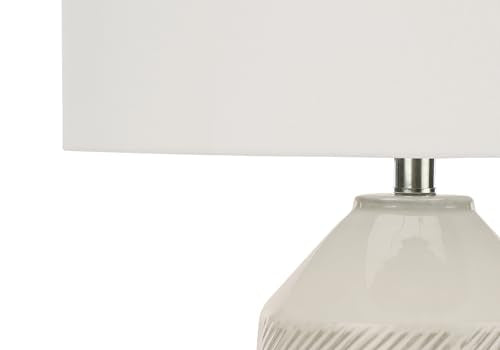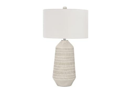 This beautiful, contemporary style 33"h table lamp with a cream ceramic textured base and ivory fabric shade, topped with a round ceramic finial is the perfect way to add some stylish and fashionable flair to any end or side table, or nightstand in your bedroom, living room and home office. The convenient 3-way switch holds a single bulb with a maximum voltage of 100W/120V (not included), allowing you to adjust the lighting to suit the ambiance in a room. Made with high quality materials, this decorative lamp includes a 2 year limited warranty against manufacturer's defects for your satisfaction. This accent lamp is sure to make a statement and brighten up any room with ease.