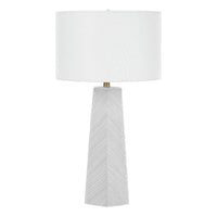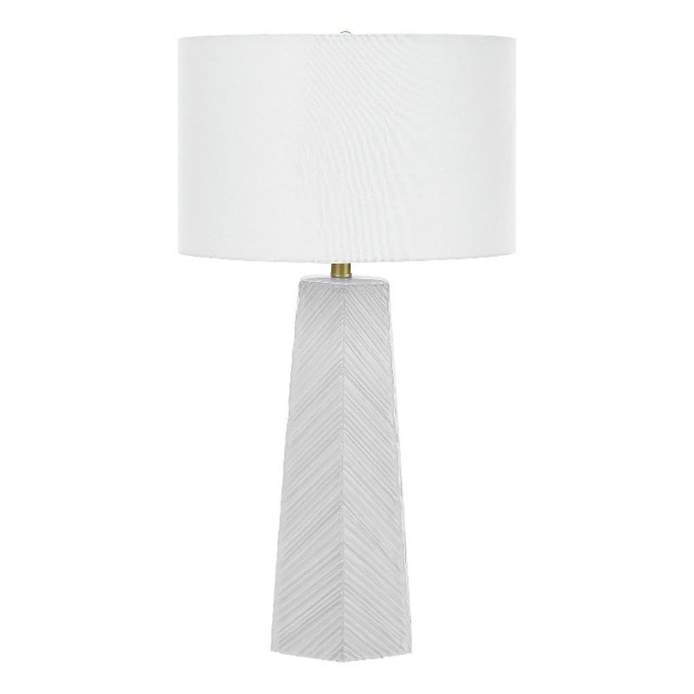 Bring some contemporary sophistication to any room with this stylish 29"h table lamp. A beautiful blend of art-deco with a modern design, the smooth white ceramic columnar base with geometric groove lines is complimented with an elegant ivory linen drum shade, and finished with a gold metal finial on top. With a 3-way switch that houses a single bulb (not included) for a maximum output of 100W/120V, this lamp offers three levels of illuminating light for creating the ambiance you desire. Attached with a 6ft transparent cord, this is the perfect accent lamp to place on an end or side table in a livingroom or home office, or bring it into your bedroom to set on a nightstand or bedside table. Made with high quality materials, this lamp includes a 2 year limited warranty against any manufacturer s defects for a worry-free purchase.