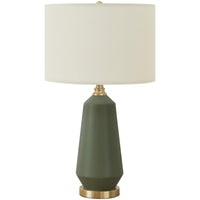 Brighten up your home with this contemporary and stylish 26"h table lamp. Featuring a unique retro inspired green ceramic base with gold metal accents and an ivory linen fabric shade, this lamp is perfect to place on any side or end table, nightstand, or bedside table. The 3-way switch with a single bulb outage of 100W/120V (not included), allows you to choose the right amount of light and ambiance in an office, living room, or bedroom space. Made with quality materials, this lamp includes a 2 year limited warranty against any manufacturer s defects for a worry-free purchase.