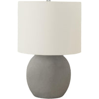 This stylish and fashionable 20"h table lamp with a grey concrete globe-shaped base and topped with a contrasting ivory linen drum shade, is the perfect accent to brighten any room. Featuring a 3-way switch holding a single bulb (not included) with an output of 100W/120V, allows you to customize the lighting ambiance in your living room, home office, or bedroom. With a contemporary appeal, place this versatile decorative lamp on a side or end table, on a console, or on your nightstand to create a warm and inviting atmosphere. Made with durable quality materials ensuring longevity, this lamp includes a 2 year limited warranty against any manufacturer s defects for a worry-free purchase.