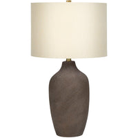 Bring some contemporary sophistication to any room with this stylish 27"h table lamp. A beautiful blend of a textured grey ceramic vase shaped base and beige linen shade, finished with a gold finial on top, this lamp is a great way to brighten any bedroom, living room or office. With a 3-way switch that houses a single bulb (not included) for a maximum output of 100W/120V, this lamp offers three levels of illuminating light for creating the ambiance you desire. Attached with a 5ft transparent cord, this is the perfect functional accent to place on an end or side table, nightstand or bedside table. Made with quality materials, this lamp includes a 2 year limited warranty against any manufacturer s defects for a worry-free purchase.