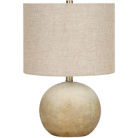 This stylish and fashionable 20"h sphere shaped table lamp with a beige concrete base in a textured finish, and topped with a beige linen drum shade and gold metal finial will be a standout accent to brighten any room. Featuring a 3-way rotary switch holding a single bulb (not included) with a maximum outage of 100W/120V, allows you to customize the ambiance in your living room, home office, or bedroom. With a chic contemporary appeal and attached with a 5ft clear cord, place this versatile decorative lamp on a side or end table, or on your nightstand or bedside table to create a warm and inviting atmosphere. Made with durable quality materials ensuring longevity, this lamp includes a 2 year limited warranty against any manufacturer s defects for a worry-free purchase.