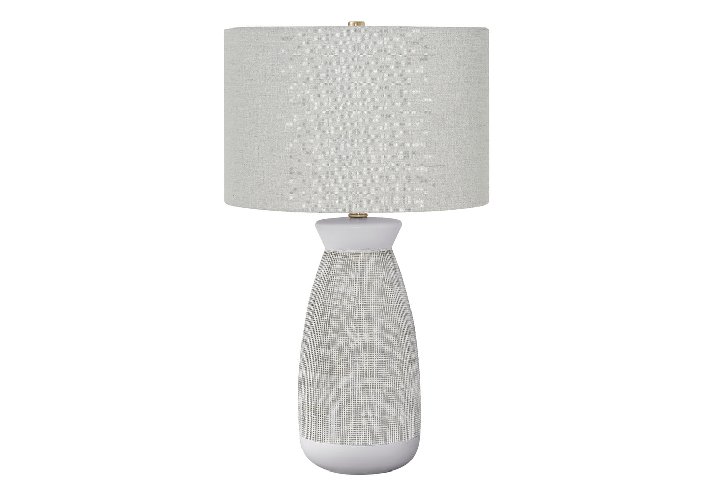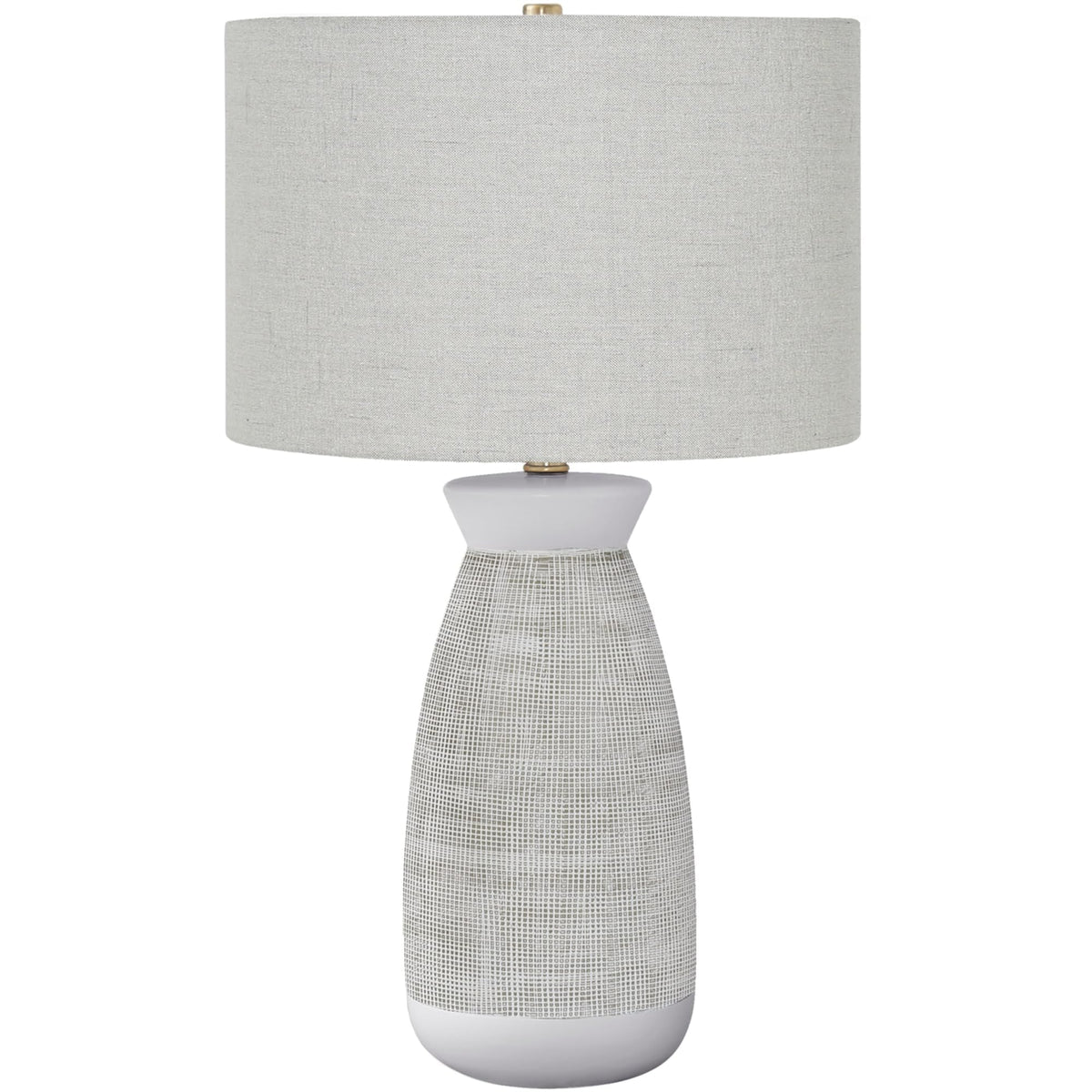 Bring some fresh contemporary style to any room with this casually elegant 27"h table lamp. Showcasing a beautiful blend of a smooth white and textured grey on the vase shaped ceramic base, with a grey linen drum shade, and finished with a silver metal finial on top, this lamp is a great way to brighten any bedroom, living room or office. With a 3-way switch that houses a single bulb (not included) for a maximum output of 100W/120V, this lamp offers three levels of illuminating light for creating the ambiance you desire. Attached with a 5ft transparent cord, this is the perfect functional accent to place on an end or side table, nightstand or bedside table. Made with quality materials, this lamp includes a 2 year limited warranty against any manufacturer s defects for a worry-free purchase.