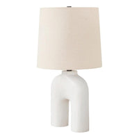 Design brings modern whimsy with this trendy 25"h table lamp that packs a big punch. Featuring a unique cream resin arch-shaped base with a tapered drum beige linen shade and black finial on top, this stylish decorative accent is crafted to brighten your office, living room, or bedroom. The 3-way switch housing a single bulb (not included) for a maximum output of 100W/120V, allows you to adjust the ambiance of a room to your desired level of lighting. Attached with a convenient 5ft transparent cord, this versatile lamp can be placed on a side or end table, a nightstand or bedside table to bring a distinctive, yet fun look to a contemporary space. Made with quality materials, this lamp includes a 2 year limited warranty against any manufacturer s defects for a worry-free purchase.