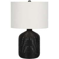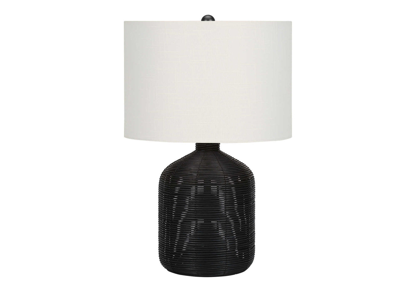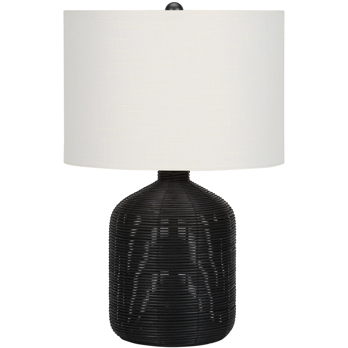 Add a casual chic ambiance to your living room, home office, or bedroom with this stylish and fashionable 23"h table lamp. This ginger jar shaped lamp features a black rattan base and a linen ivory drum shade, finished with a black finial on top. Create the perfect lighting conditions using the 3-way switch that holds a single bulb (not included) for a maximum output of 100W/120V, allowing you to adjust the brightness in a room. Attached with a 5ft black cord, place this versatile, modern accent lamp on any end or side table, nightstand or bedside table to create an inviting space. Made with durable materials for longevity, this lamp includes a 2 year limited warranty against any manufacturer s defects for a worry-free purchase.