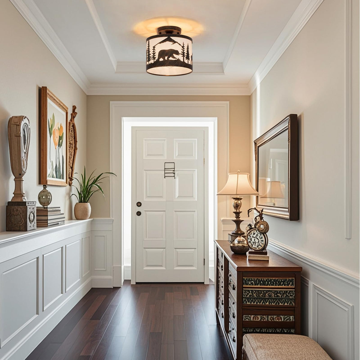 Q: What kind of decor styles does this light complement?A: This Rustic Semi Flush Mount Ceiling Light complements vintage industrial, farmhouse, and rustic decor styles, making it perfect for cabins, lodges, or any home with a wildlife theme.