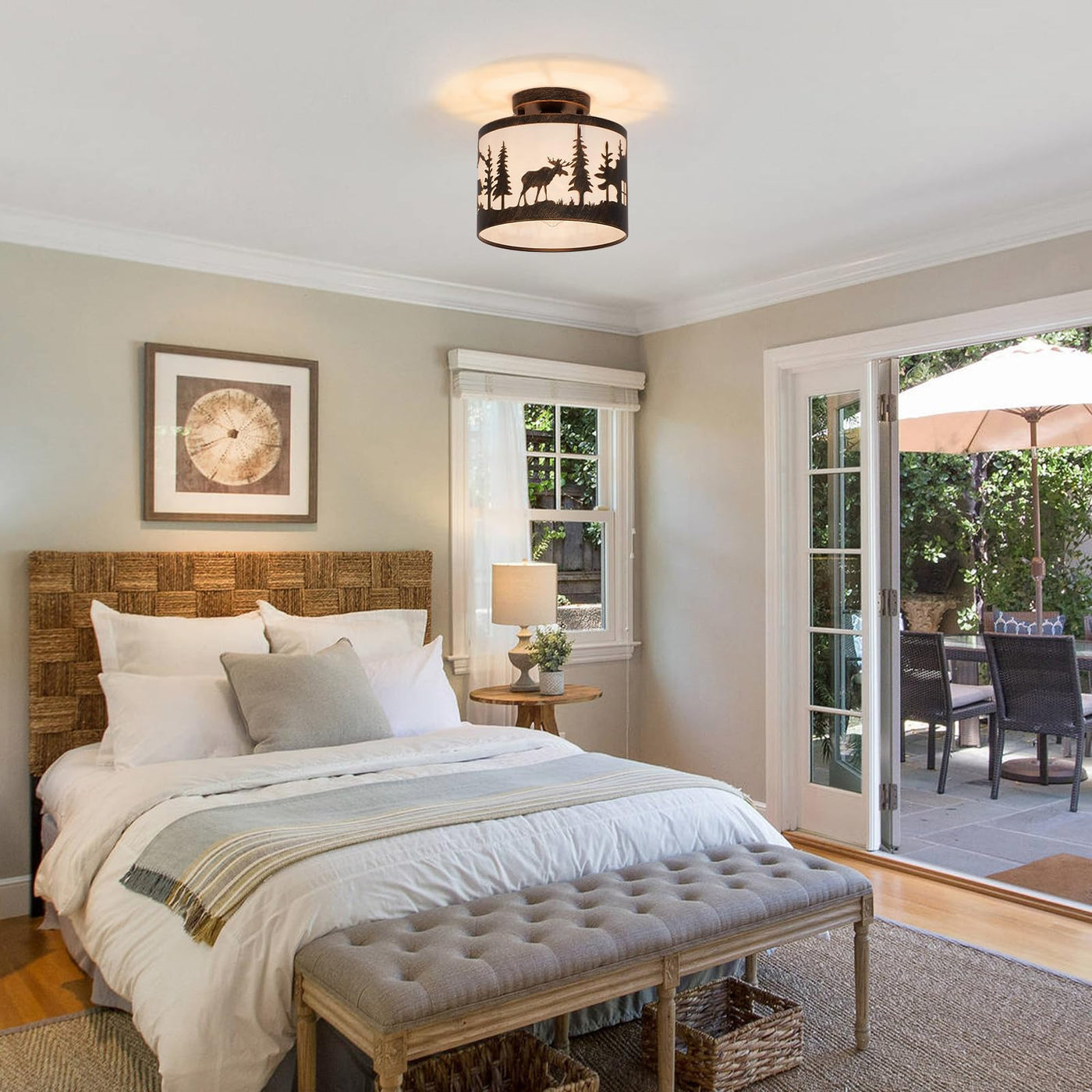Monaxon Rustic Semi Flush Mount Ceiling Light, Black Metal, Wildlife Forest Theme, E26 Base, 9.1in Round, With Shade