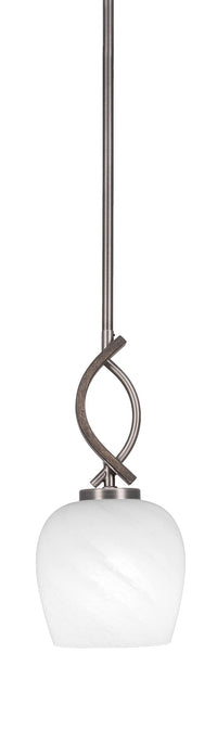 Q: What materials are used in the construction of this pendant light?A: The Monterey 1 Light Mini Pendant features a combination of graphite and painted distressed wood-look metal for the body, complemented by a 6-inch white marble glass shade.