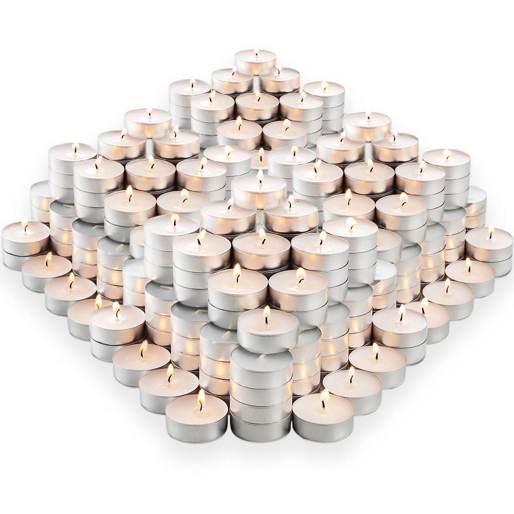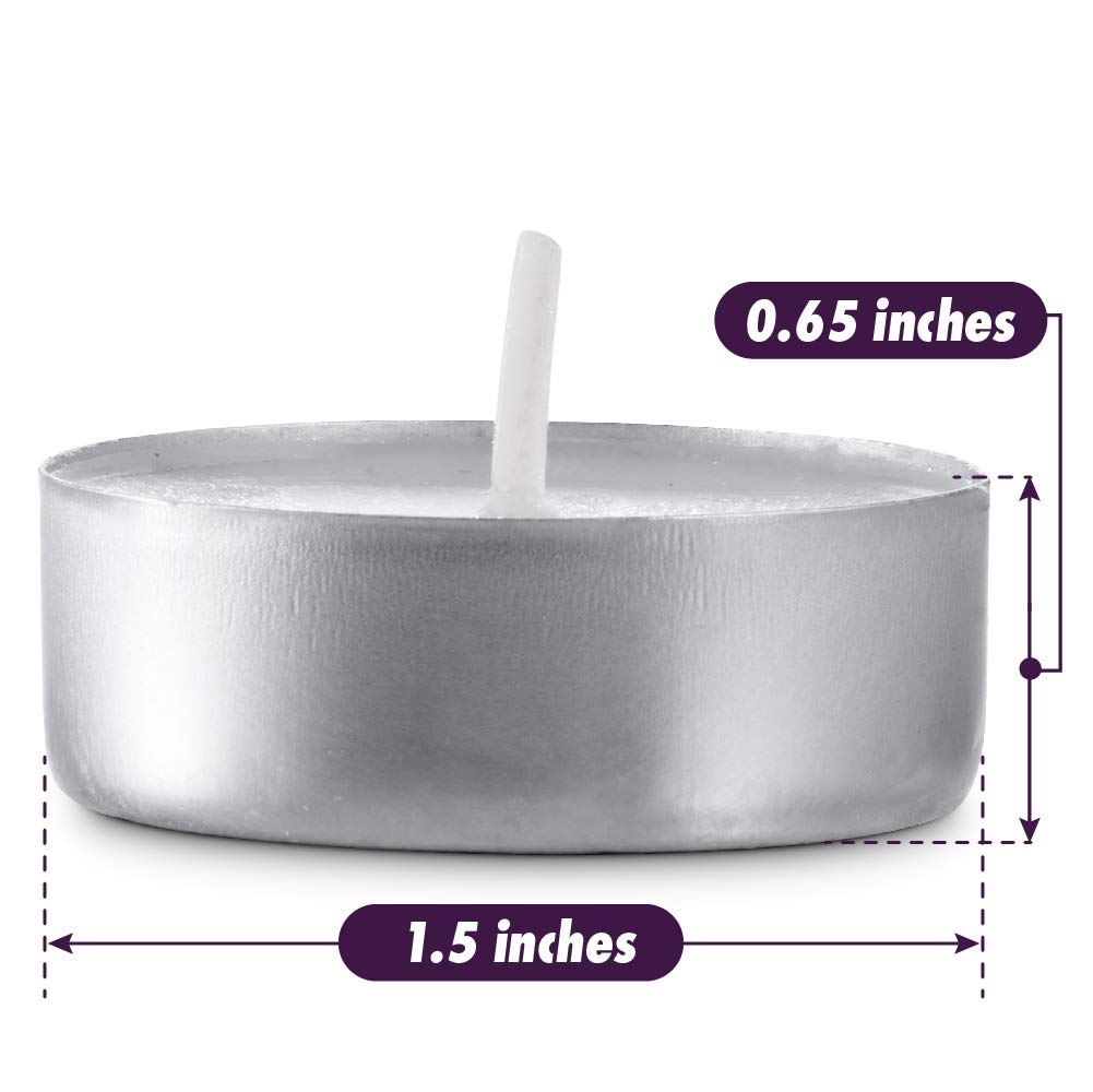 HANDY PREMIUM TEA LIGHTS CANDLES IN BULK: The 45 tea candles are compact yet generous in size (1.5” in diameter & 0.65” in height). These tealight candles are not only pretty & useful, they’re also very economical - perfect for big events like weddings! | EXTRA LONG-LASTING BURN TIME: Our tealights ensure a long-lasting burn for up to 4 continuous hours. The romantic candles’ 100% cotton wicks improve the burning process; you’ll enjoy a smokeless flame that flickers less than others. | PERFECT FOR ROMANTIC NIGHTS: Explore the useful nature of our tea lights! They’re great for Valentine’s day, weddings, anniversaries, home décor, Christmas holidays, pool parties, DIY crafts, church, emergency, survival & candles. | SUPERIOR QUALITY EUROPEAN WAX: These mini candles are made of superior, non-flaky pressed paraffin wax from Europe and come in durable aluminum tins that keep the dripless wax contained, protecting your nice furniture from stains. | A COZY AND WELCOMING AMBIANCE: Upgrade your home décor with our tea lights, featuring a flame that gives off the perfect amount of light - for romantic dinners indoors or outdoors, bedroom, bathroom, guest rooms, traveling & more.