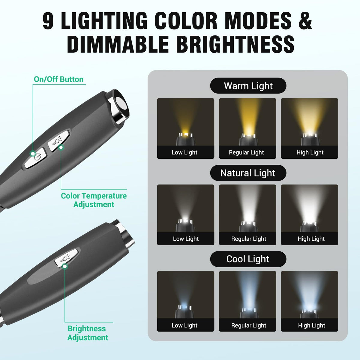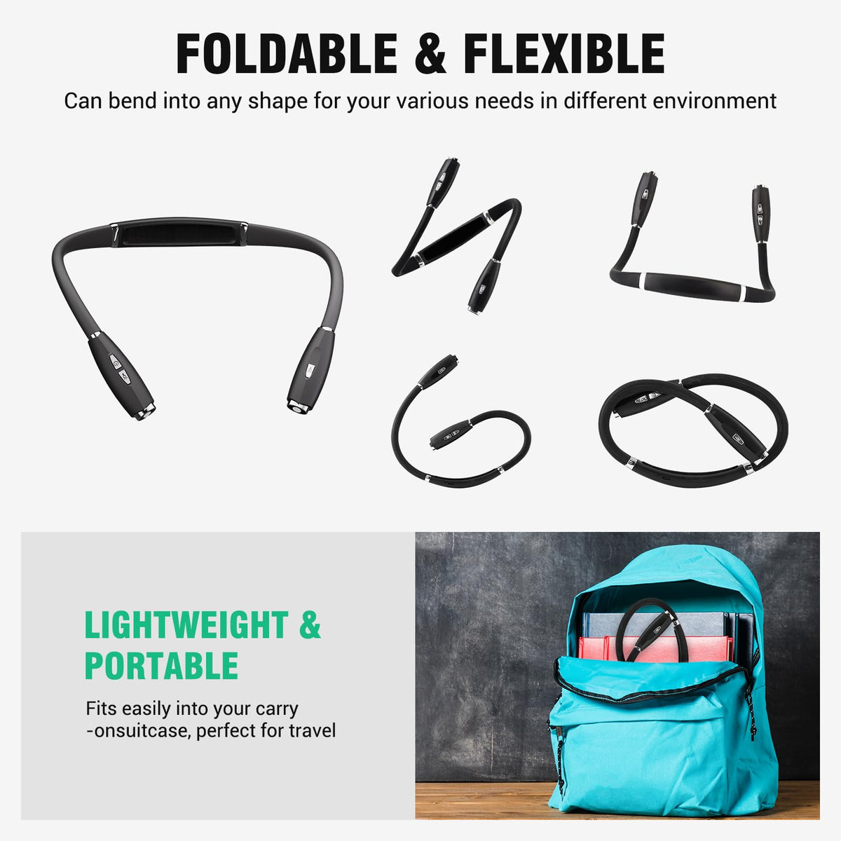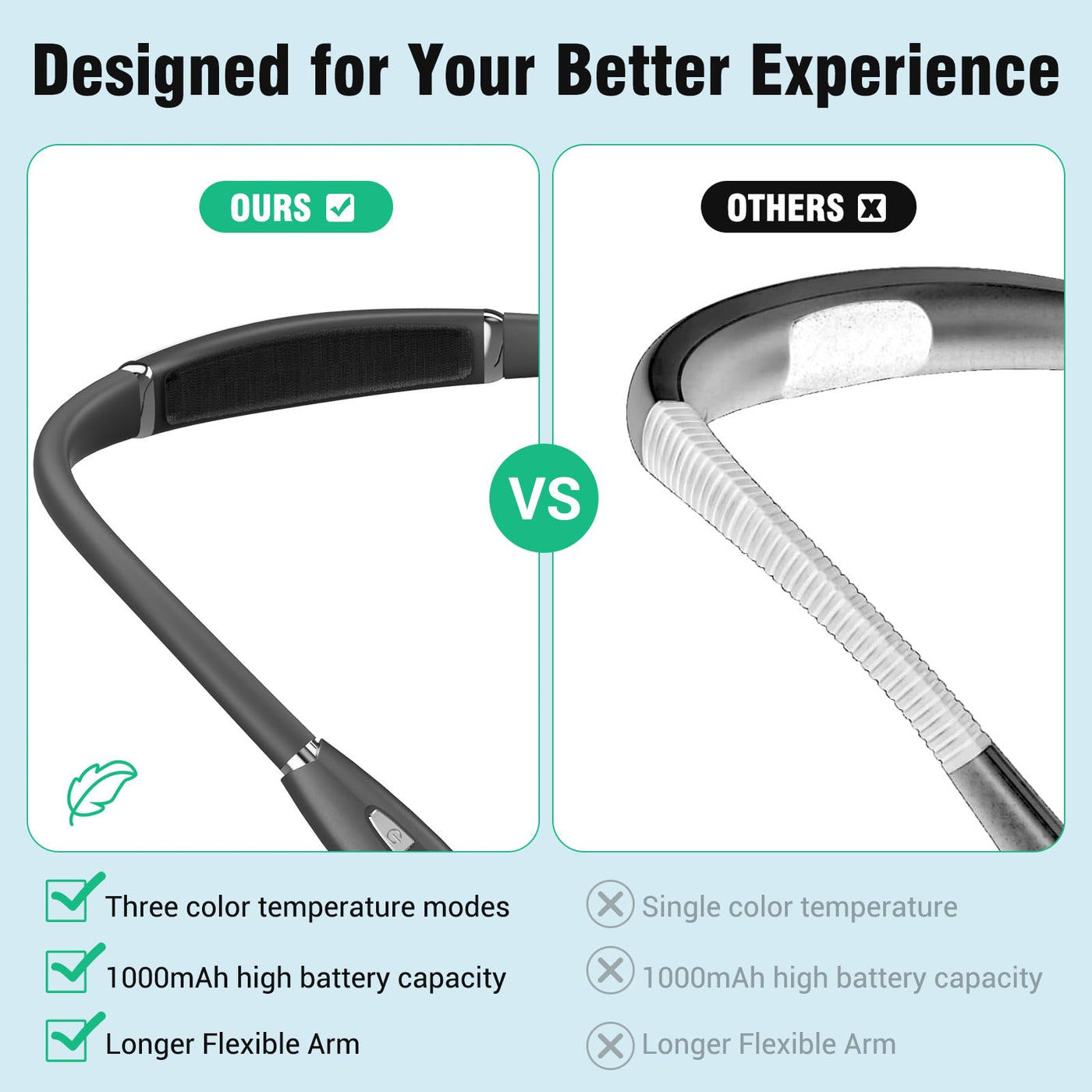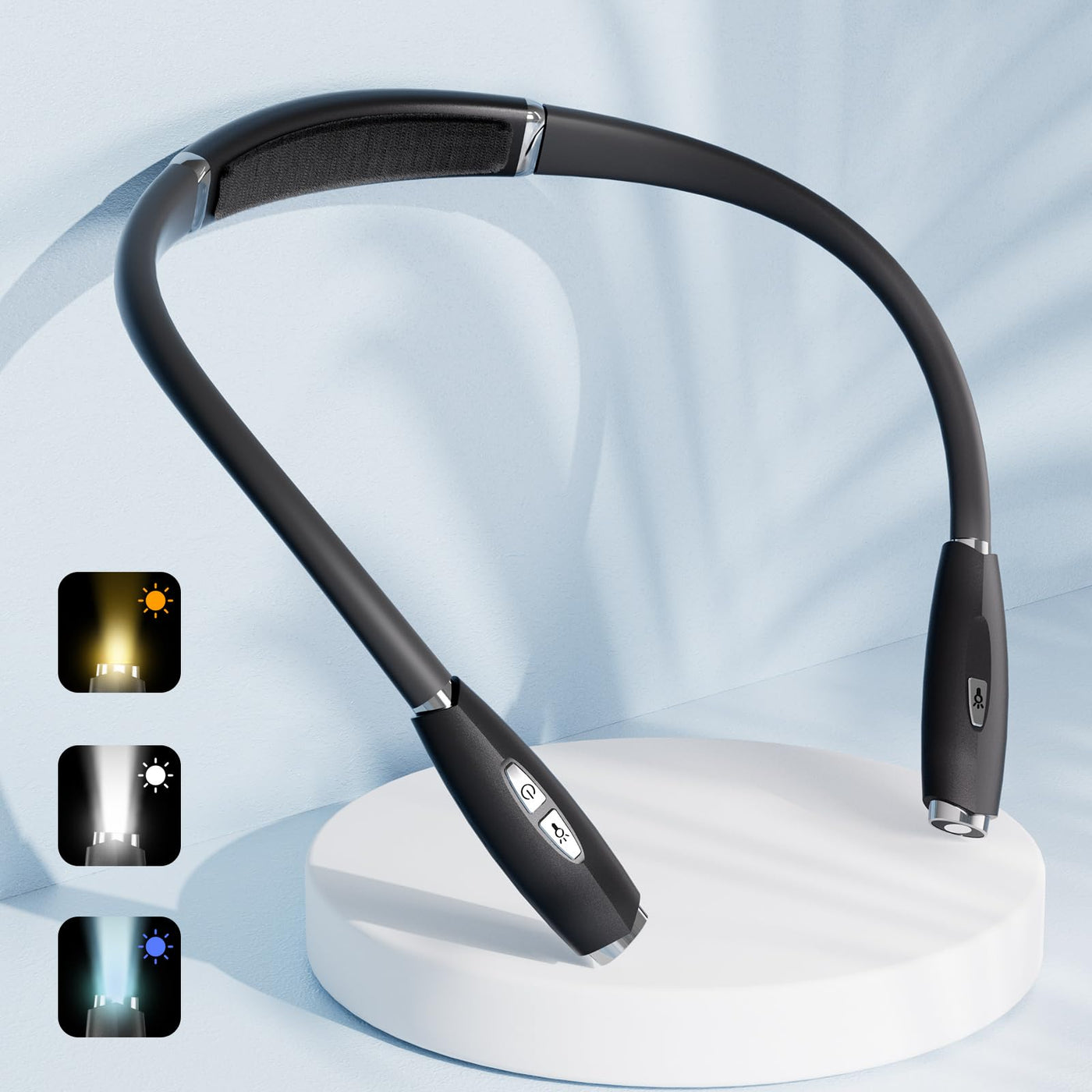 Mood Pie neck light are reusable with long-lasting batteries;Mood Pie neck lamp is lightweight, portable and easy to store;Mood Pie LED neck reading light can be adjusted 360 degrees for more comfortable use;Mood Pie neck flashlight are widely used in bed, sofa, travel, camping, walking the dog, etc.;Mood Pie neck reading light with 3 brightness levels and multi-color eye protection to reduce eye fatigue;Mood Pie neck book light help you focus on reading, knitting, repairing, cross-stitching, crochet, crafting, etc.;