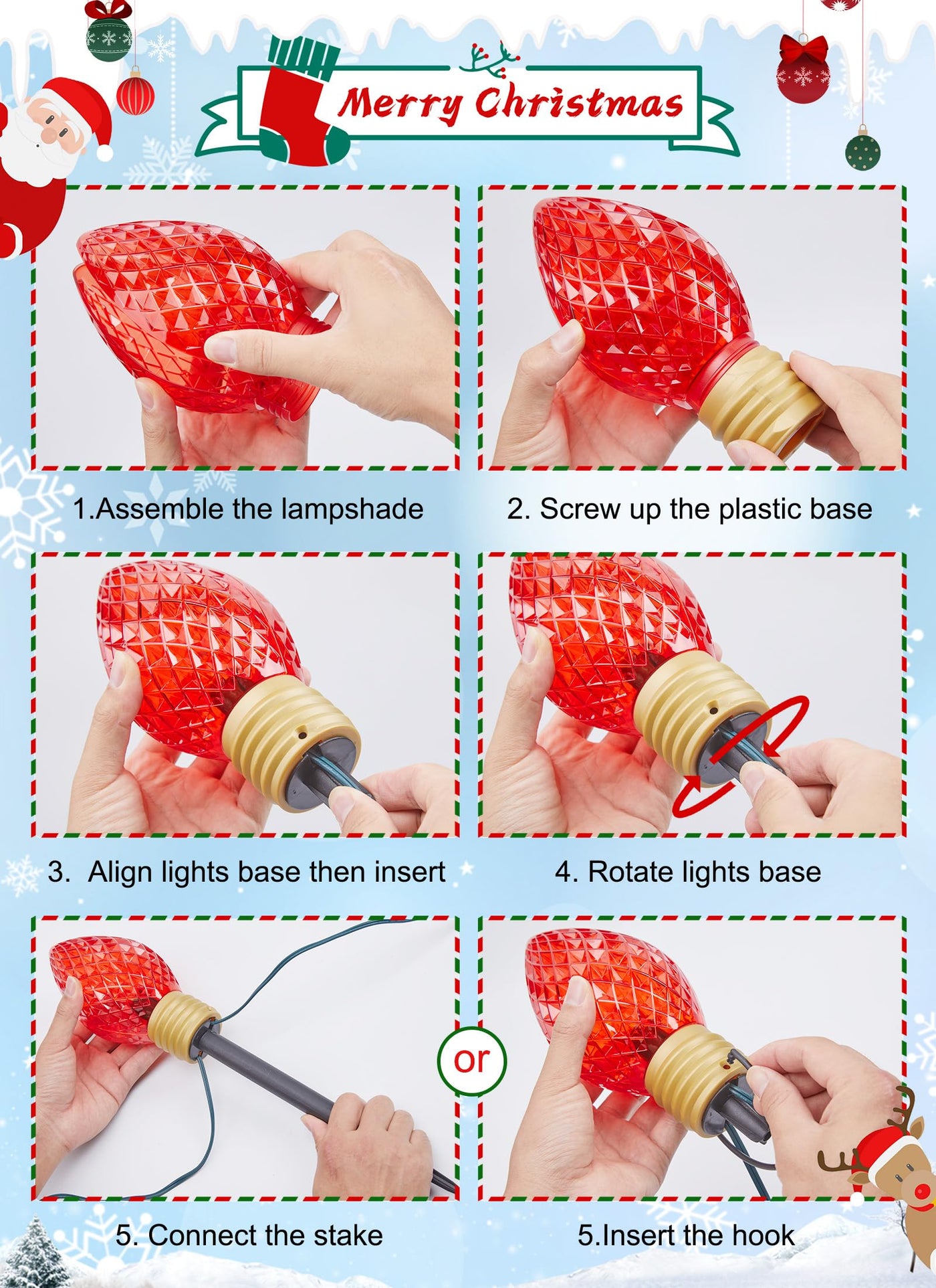 Q: How do I install the Moonflor Strawberry Jumbo C9 Christmas Pathway Lights?A: These lights offer two convenient installation methods. You can use them as traditional path lights with ground stakes or hang them on your roof, windows, or fence using the included hooks.