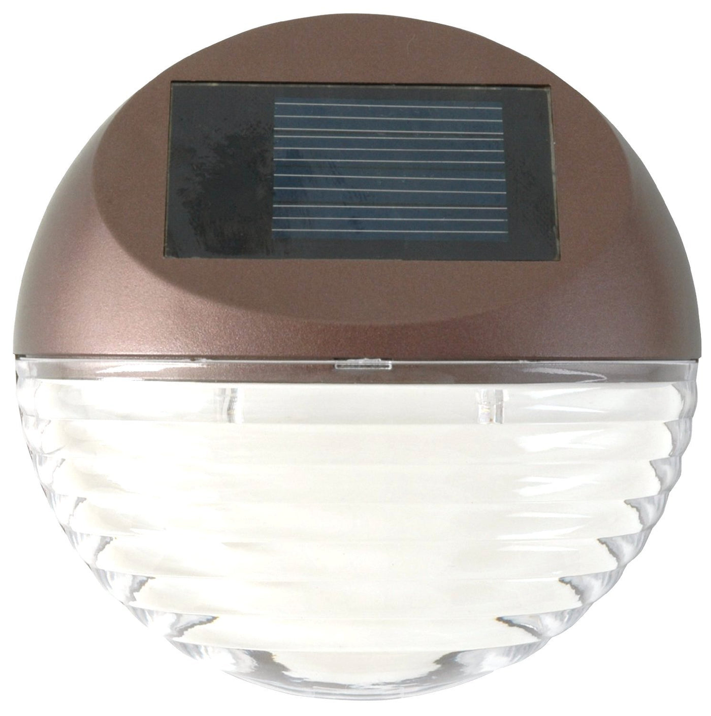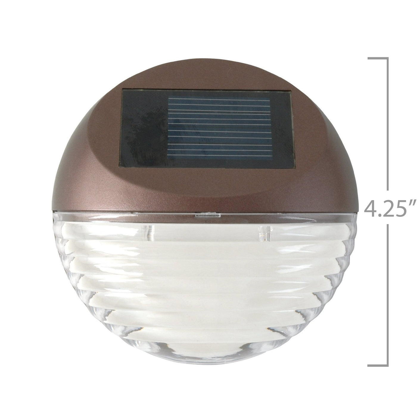 Add both light and beauty to your deck or patio with this sleek outdoor wall sconce. Powered only by the suns rays thanks to its rechargeable nickel-cadmium battery, the natural white LED light turns on automatically at dusk. Made of bronze plastic housing with a clear lens, the sconce is durable enough to stand up to the great outdoors without rusting or cracking. Use it to illuminate that tricky step or install several of them around an outdoor seating area for a lovely outdoor ambiance.