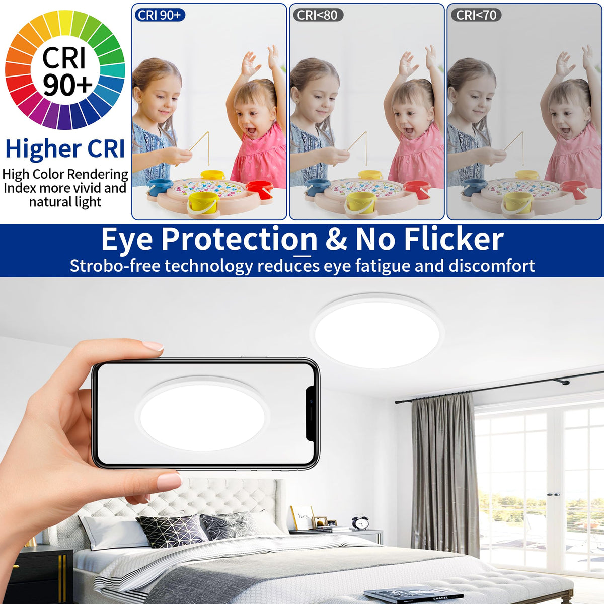 Q: Does the ceiling light have an eye protection feature?A: Yes, the design incorporates side lighting and a frosted acrylic cover, which helps convert bright light into a softer illumination, reducing eye strain.