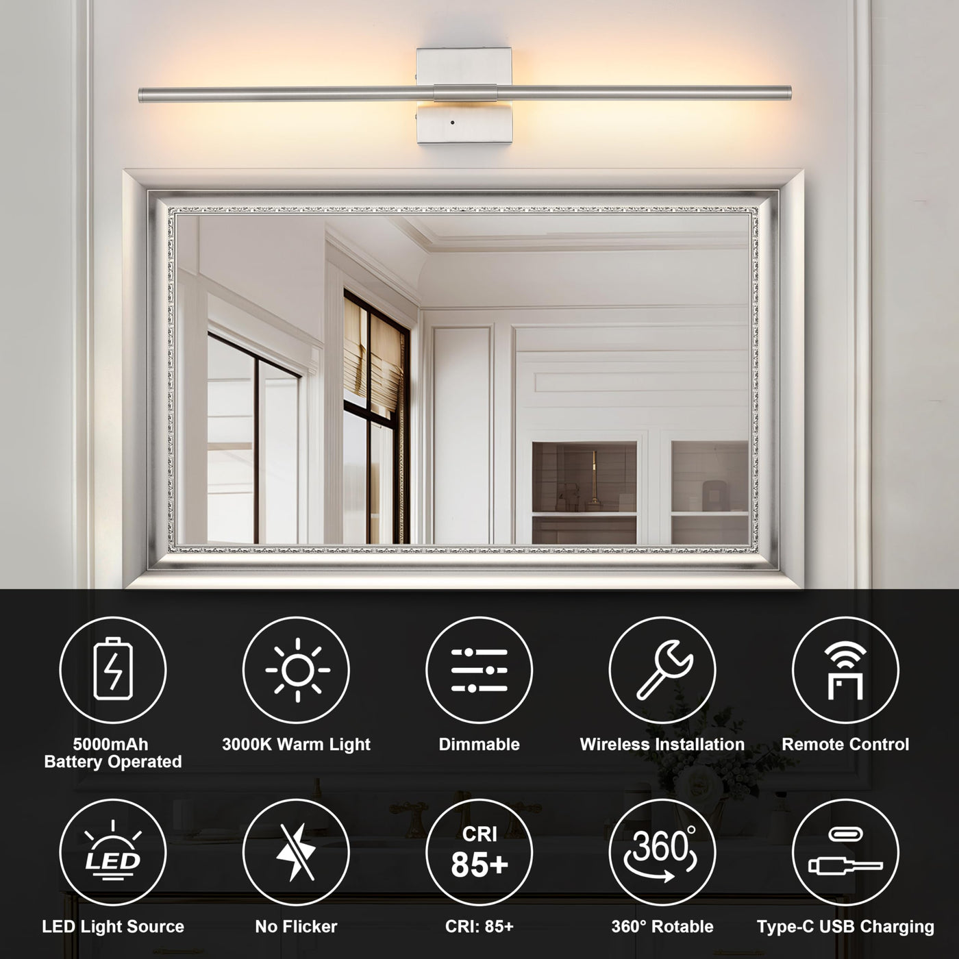 Battery Operated Wall Sconce, Rechargeable Wall Lights with Remote Control, Sand-Nickel Wireless Modern Wall Lamps, 40 Inch LED Bathroom Vanity Light Fixtures Dimmable Over Mirror