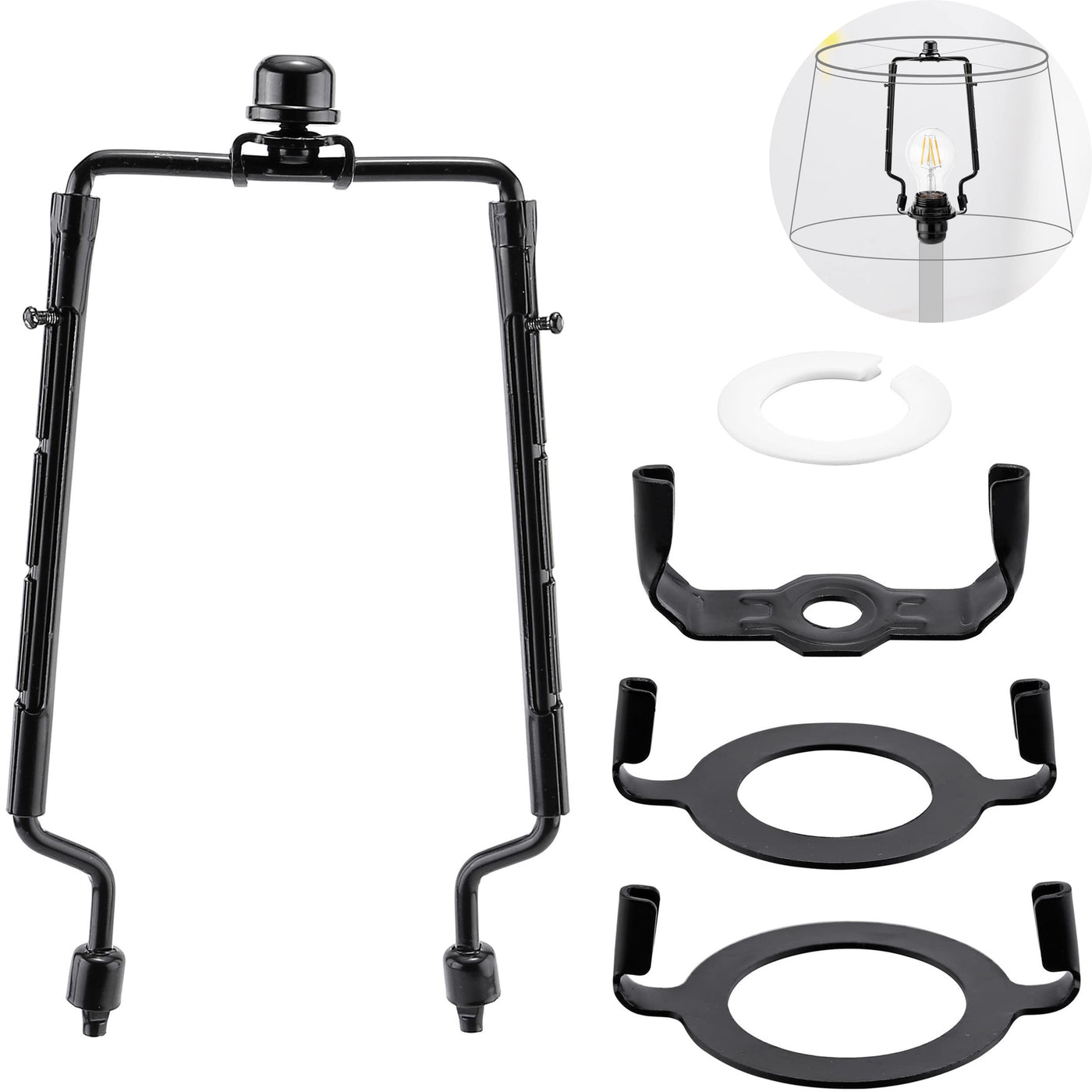 Mornajina 7 8 9 10 inch Lamp Shade Harp Holder, Adjustable Lamp Harps and Finals, Fit both Standard Lamp Rod and E26 E27 Light Base UNO Fitter Adapter Converter Finial Set (Black)