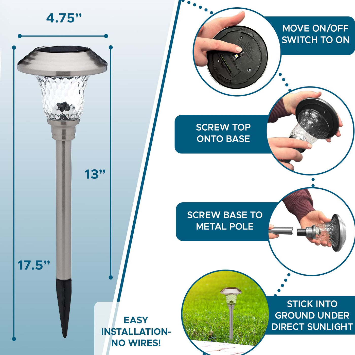 Morvat’s Outdoor LED Solar Path and Garden Lights are the ideal way to light up and beautify your walkway or garden. Imagine these beautiful, sleek lights shining in your yard and lighting up your pathway!They will look striking lining driveways, paths and even to highlight areas in your garden; and with such a beautiful garden or path- you’ll be the envy of your neighborhood! Important: Before using for the first time make sure they get an adequate 6-8 hours of sunlight during the day. The duration of the light will depend on the solar product’s level of sunshine exposure, geographical location and hours of daylight. Features: Deliver a bright light to enhance outdoor spaceSave energy by using sunlight to charge batteryEasy installation in minutesWeather Resistant Specifications: Made from Stainless Steel with Glass LensSolar Panel: 0.24W/2V MonoLight Source: Extra Bright LED (white)Dimensions: 13”L x 5”W