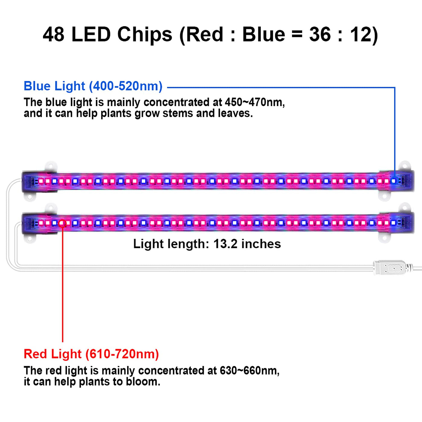 Material: PVC Rated Power: 20 Watts Input Voltage: 5V LED Chips Ratio: (Red : Blue) = 32 : 16 Red Light Wavelength: 630 nm Blue Light Wavelength: 460 nm Lifetime: 50000 hours Light Bar: 13.2 inches USB Cord: 78 inches