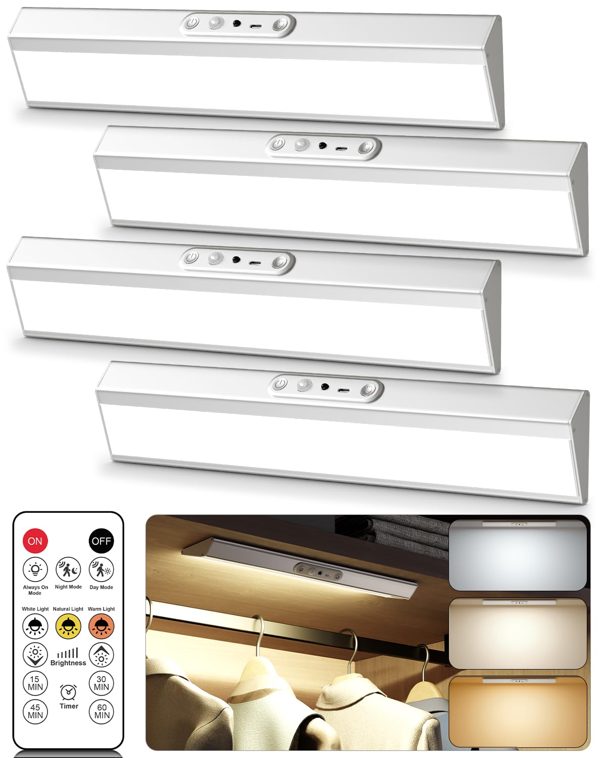 Motion Sensor Closet Lights, Eye Protection Design Under Cabinet Lighting Wireless with Remote Control, 3 Color Temps & Dimmable