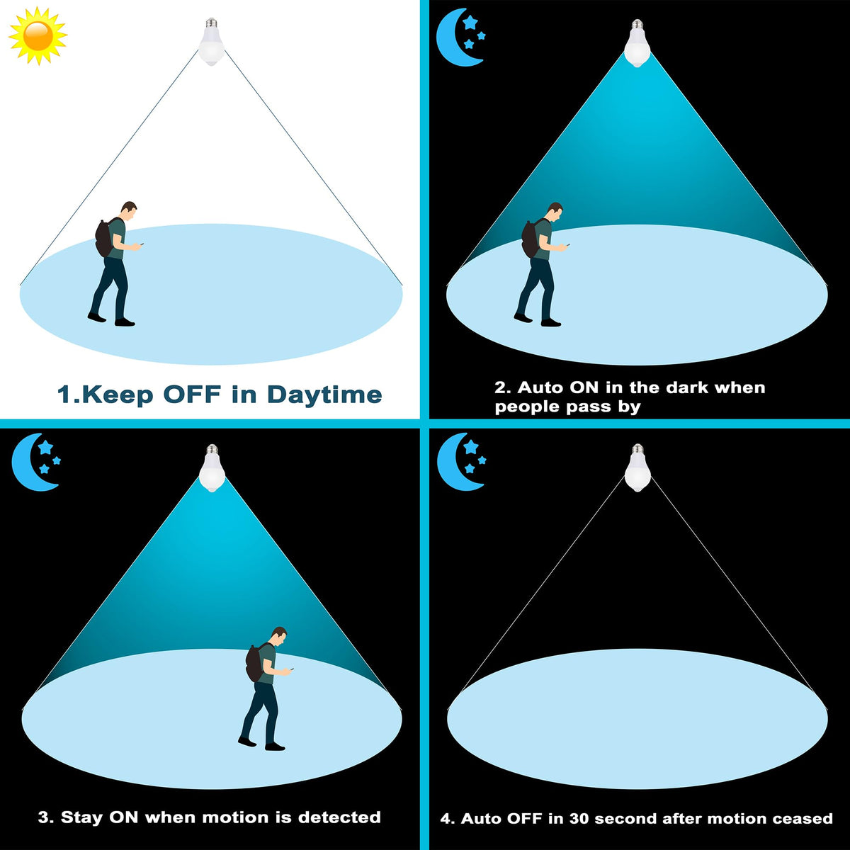 Q: How do the dusk to dawn features work in these LED bulbs?A: These LED bulbs are equipped with a smart dusk to dawn sensor that keeps the light off during the daytime or in bright environments. They activate the motion detection function at night or in dark areas, ensuring energy efficiency.