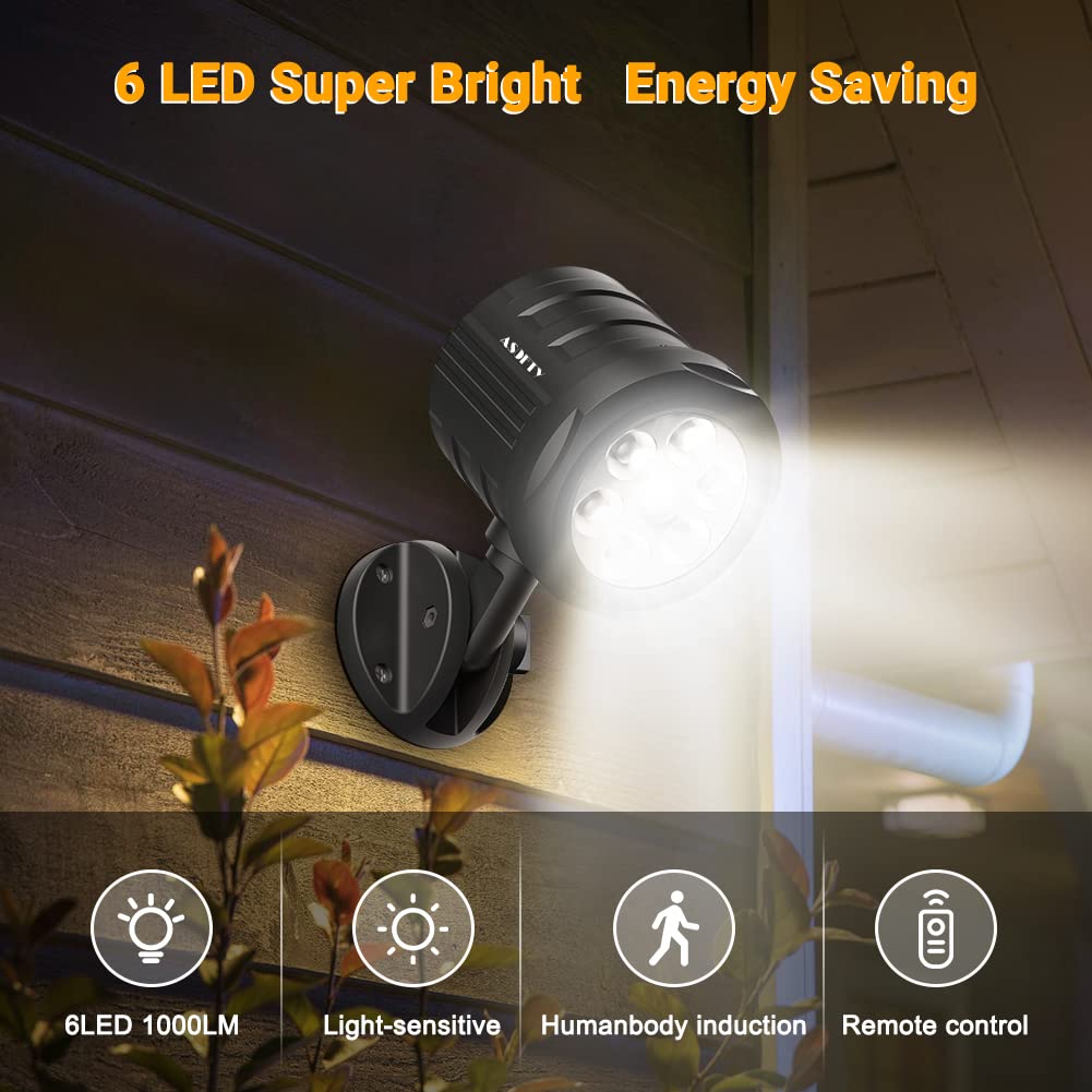 Motion Sensor Outdoor Light Battery Operated, Asofty 6 Led 1000 Lumen Wireless Spotlights With Remote Control, Ip65 Waterproof 6000K Motion Security Light For Garage Yard Porch And Patio