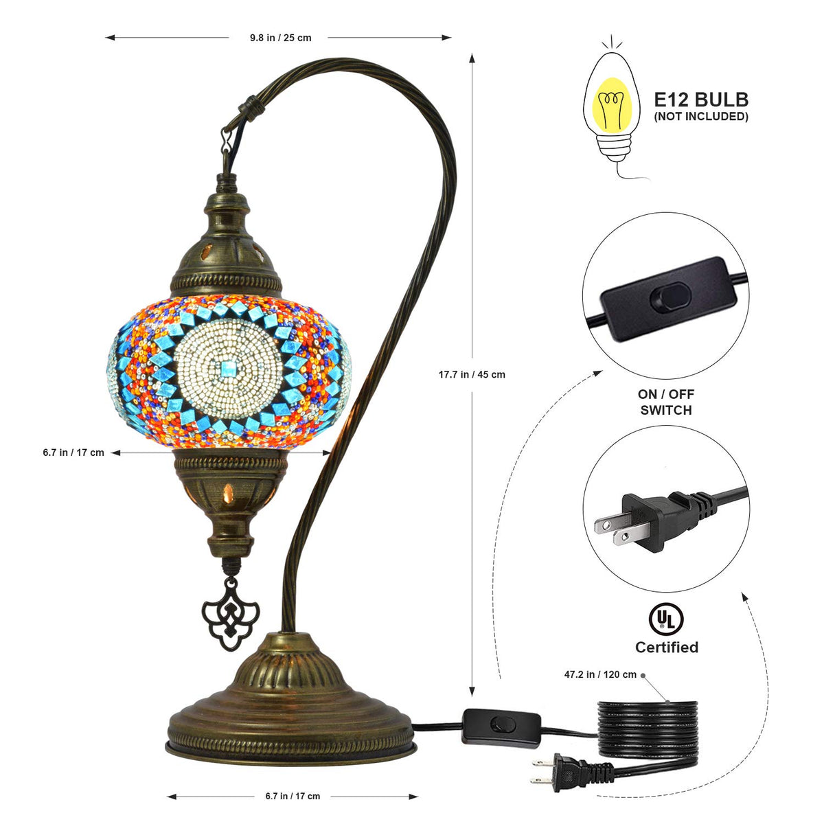 - Why Should You Choose The Mozaist? As In Many Products, Fake Of Mosaic Lamps Are Produced Around The World. As Mozaist, We Have Contributed Greatly To Keeping The Quality Perception At The Highest Level By Sending The Table Lamps Of Which We Are The Main Manufacturer To Many Parts Of The World. If You Want To Have An Original Mosaic Lamp, Make Sure You Get It From Mozaist. - Your Safety Is Very Important To Us: We Prioritize Your Safety As Much As We Pay Attention To The Quality Of The Glasses We Produce. All Quality And Safety Certificates Of Our Products Have Been Obtained And All Safety Tests Have Been Passed Successfully. (Ul, Ce) All Connection Points Are Bolted. We Don'T Use Tape Etc. All Glasses Are Manufactured Using The Best Quality Colored Glass. It'S Not Painted. - Specifications: Quantity: 1 Swan Neck Mosaic Table Lamp With Us Plug, E12 Socket (Not With Plug Converter), And On/Off Switch Size: 9.84X17.8X6.3 Inch Globe Size: 6.69 Inch Color: Blue, Green, Turquoise, Pink, White, Colorful, Multicolor, Orange Red, Dark Green, Light Purple, Mix Brown, Light Green, Rainbow - Inside The Package: 1X Turkish Mosaic Swan Neck Boho Lamp Note: Please Check The 1St Photo To Make Sure Which Item You Are Purchasing. You Can Use The Turkish Lamp With An E12 Bulb. The Bulb Is Not Included In The Package. You Need To Provide Bulb To Complete The Assembling. We Recommend Using E12 Led Bulbs In The Range Of 40W(Max). Please Cut Off The Power, While Installing The Bulb And Lamp.