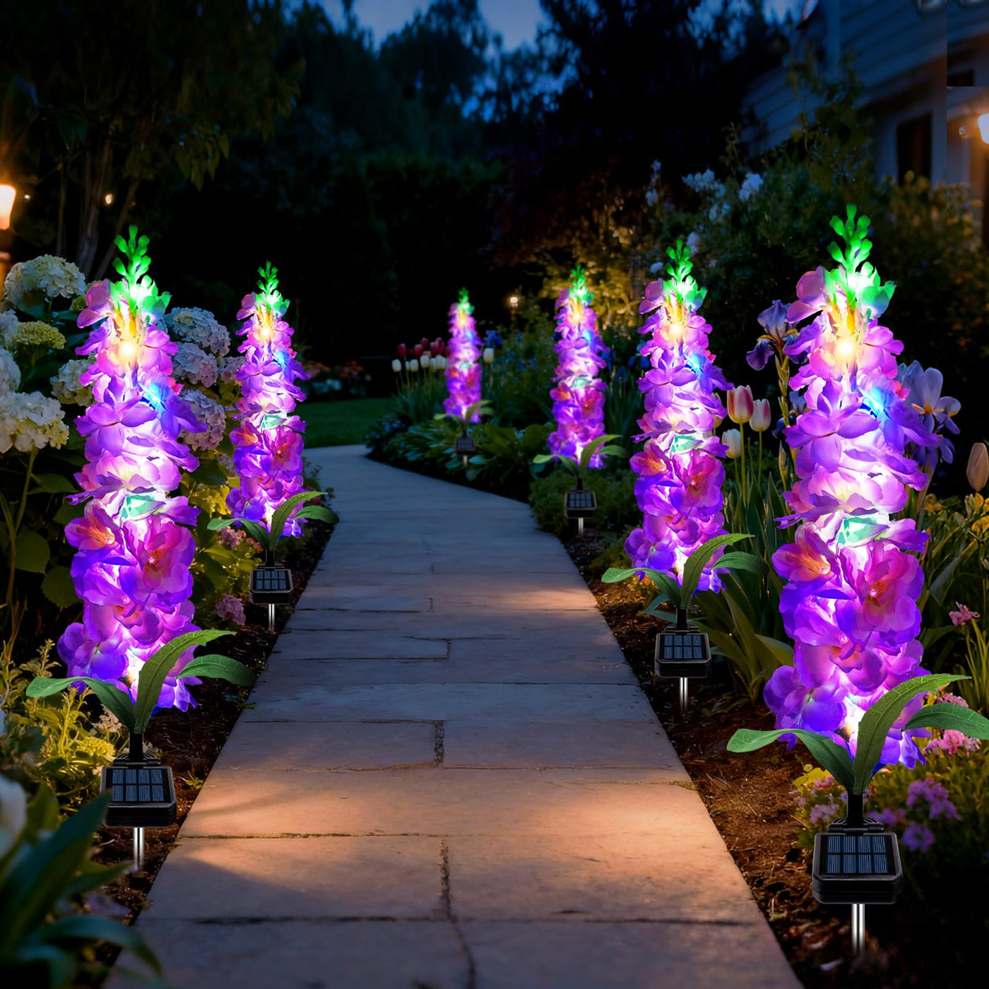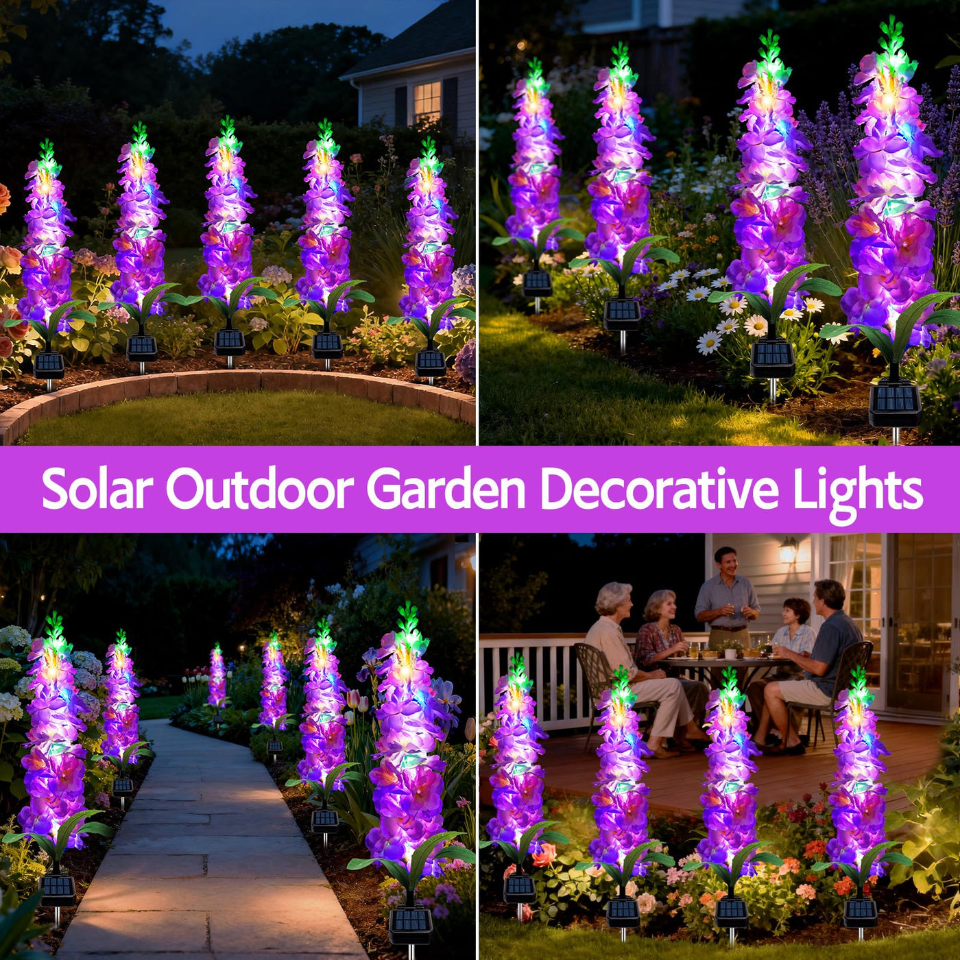 Mrhephaestus Solar Garden Lights Solar Purple Delphinium Flowers Lights 4 Pack 80 Leds Waterproof Outdoor Light Two Lighting Modes For Outside Wedding Party Garden Yard Patio Lawn Decor