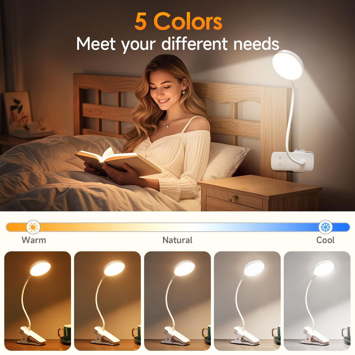 Q: What are the lighting options available on this clip-on lamp?A: This clip-on lamp offers a total of 25 lighting modes, thanks to its 5 brightness levels and 5 color temperatures ranging from 3000K to 6500K. This versatility allows you to customize the light according to your needs.