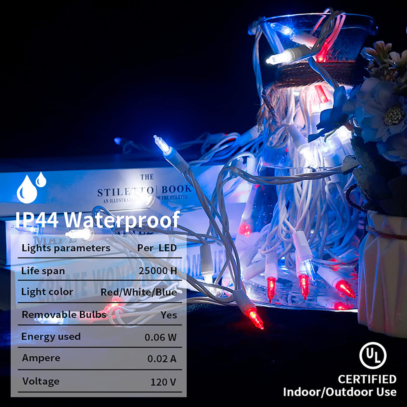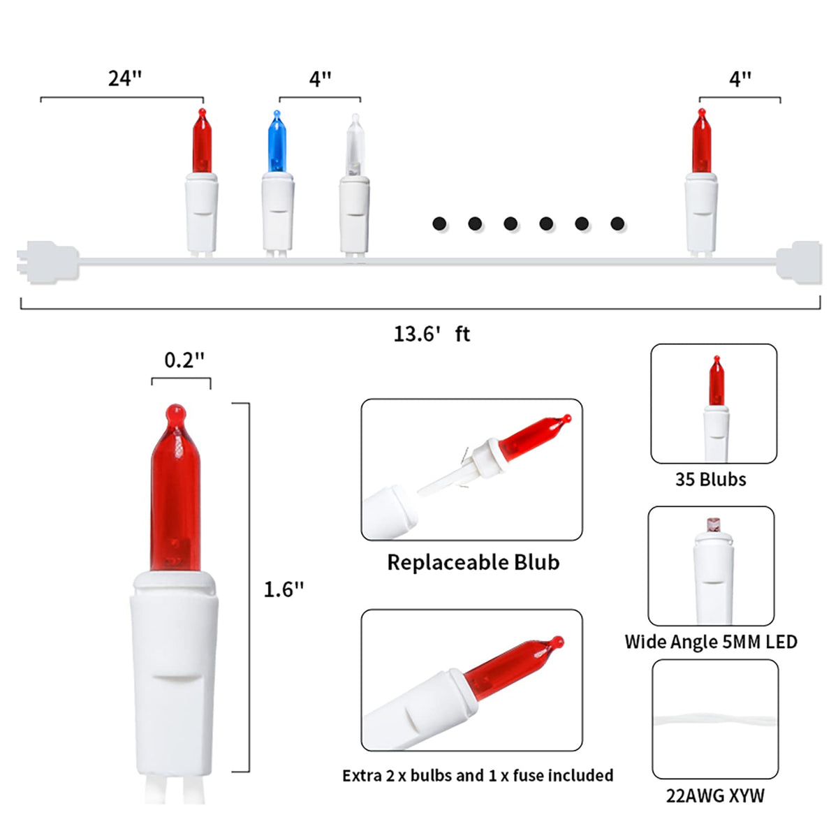 What's in the Box: - 35 LED White Wire Red White Blue Mini String Lights Independence Days Decorations - 2 x Extra LED Bulbs - 1 x Extra Fuse - 1 x User Manual / Product Description