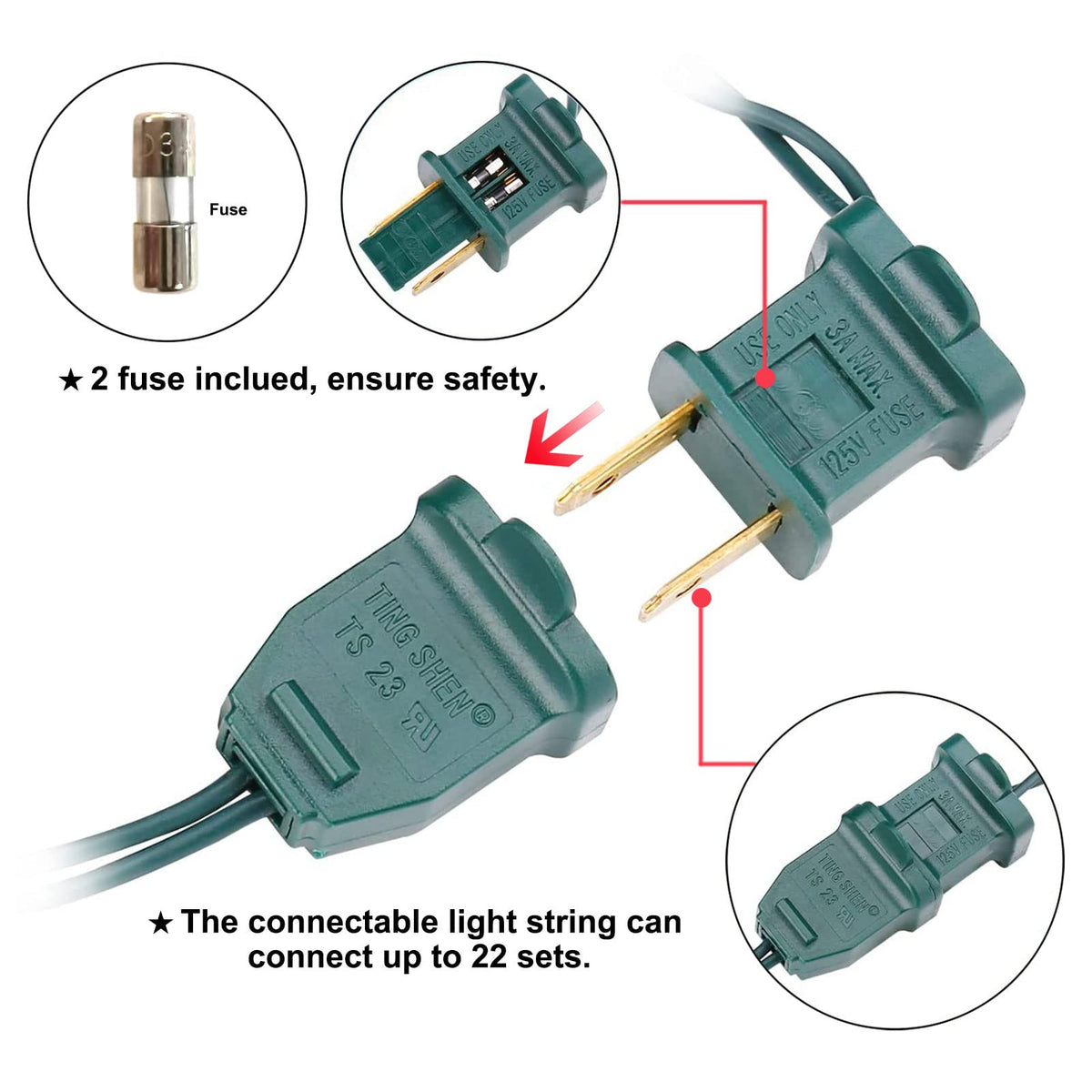 Q: Can these lights be connected end-to-end with other string lights?A: Yes, these string lights can be connected end-to-end with up to twenty-two sets, allowing for a total of two thousand two hundred bulbs.