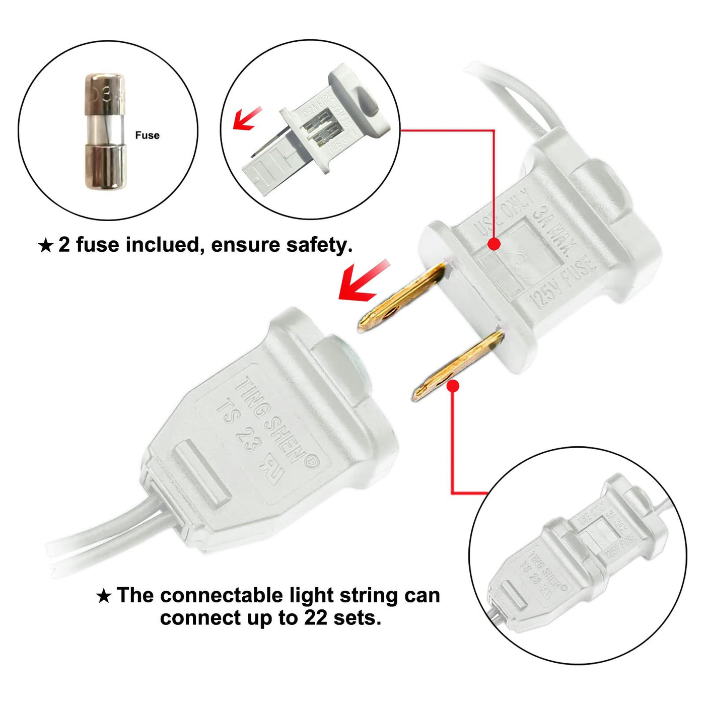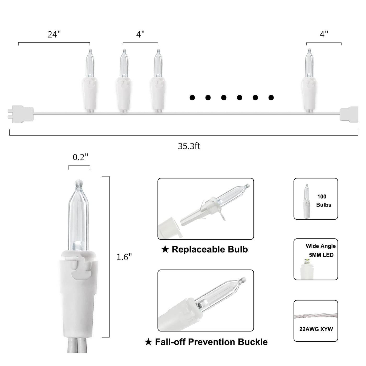 What's in the Box: - 2 x 100 White Wire Cool White Wide Angle LED String Lights - 4 x Extra Fuse - 4 x Extra LED Bulbs - 1 x User Manual / Product Description