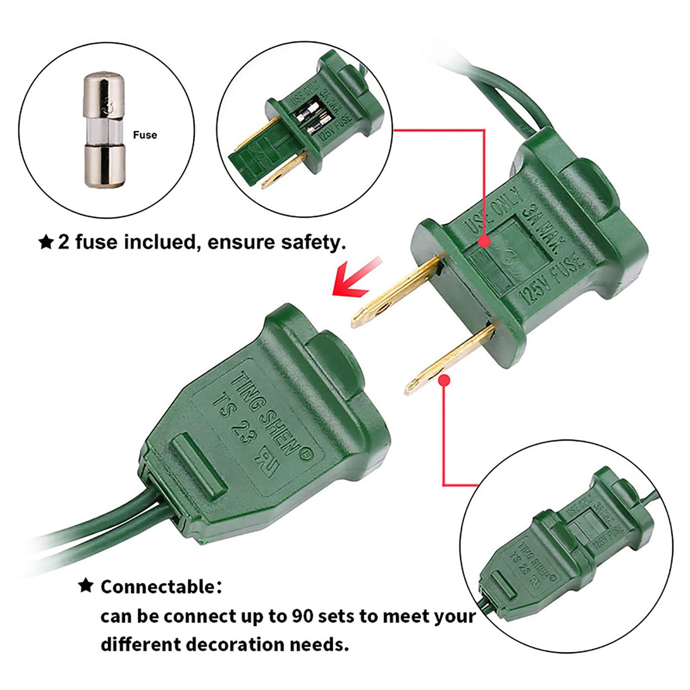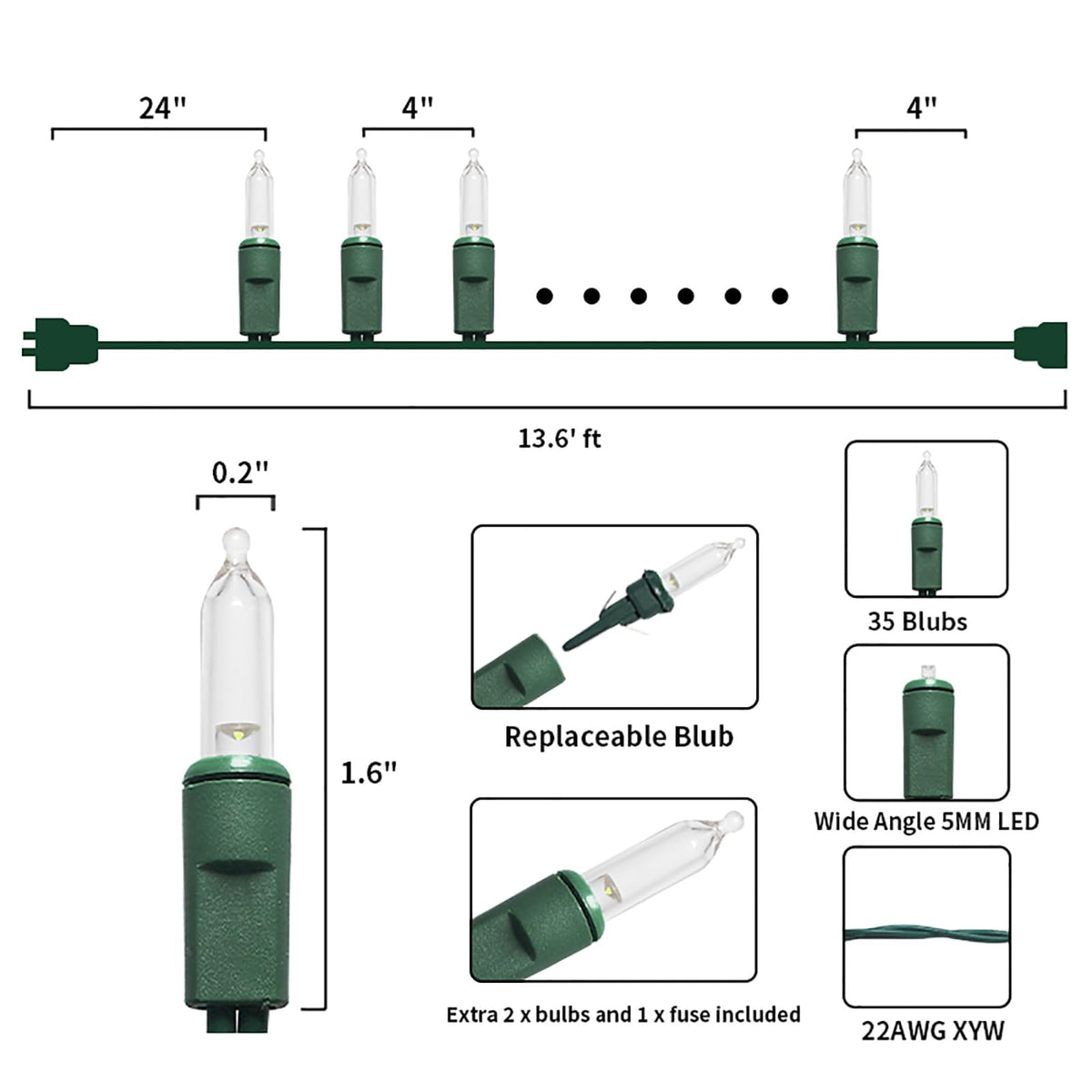 What's in the Box: - 35 LED Green Wire Cool White Mini String Lights for Christmas Decorations - 2 x Extra LED Bulbs - 1 x Extra Fuse - 1 x User Manual / Product Description