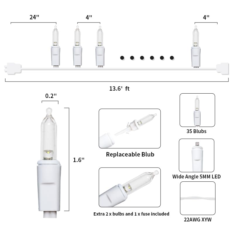 What's in the Box: - 35 LED White Wire Cool White Mini String Lights for Christmas Decorations - 2 x Extra LED Bulbs - 1 x Extra Fuse - 1 x User Manual / Product Description