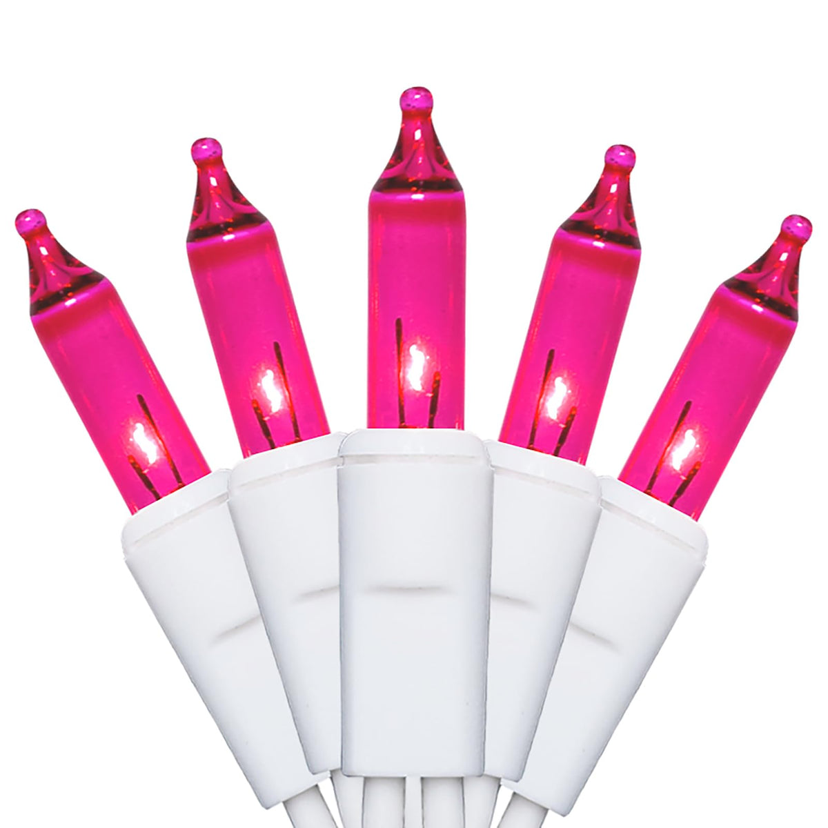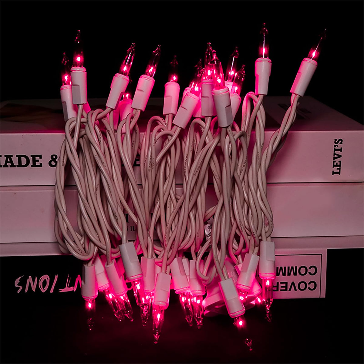 35 Count 8.5Ft White Wire Mini String Lights Incandescent Pink Christmas Lights Specifications: - Light Color: Pink - Light Display: Steady On - Bulb Type: Incandescent - Removable Bulbs: Yes - Connectable: Yes - Ingress Protection Rating: Ip44 - Usage: Indoor / Outdoor Dimensions: - Total Length: 10.25 Feet - Lights Length: 8.5 Feet - Lead: 18 Inch - Spacing: 3 Inch Actual Power: - 14.4 Watts - 216 Watts End-To-End Maximum - 15 Max Sets Connected What'S In The Box: - 1 X White Wire 35 Count Pink Mini Christmas Lights - 1 X User Manual / Product Description