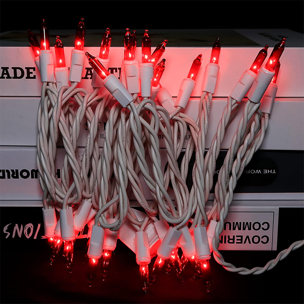 35 Count 8.5Ft White Wire Mini String Lights Incandescent Red Christmas Lights Specifications: - Light Color: Red - Light Display: Steady On - Bulb Type: Incandescent - Removable Bulbs: Yes - Connectable: Yes - Ingress Protection Rating: Ip44 - Usage: Indoor / Outdoor Dimensions: - Total Length: 10.25 Feet - Lights Length: 8.5 Feet - Lead: 18 Inch - Spacing: 3 Inch Actual Power: - 14.4 Watts - 216 Watts End-To-End Maximum - 15 Max Sets Connected What'S In The Box: - 1 X White Wire 35 Count Red Mini Christmas Lights - 1 X User Manual / Product Description