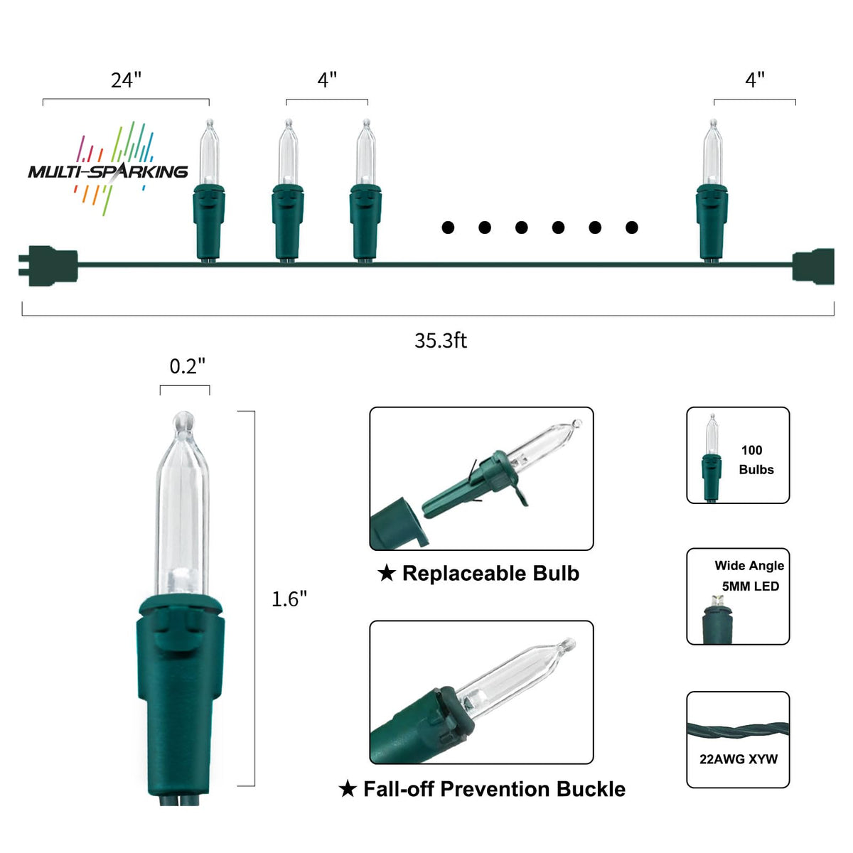 Q: What are the key features of the MULTI-SPARKING Warm White Christmas Lights?A: The MULTI-SPARKING Warm White Christmas Lights feature 35 LED bulbs on a 11-foot green wire string, with a warm white light color. They have a steady light display, are UL certified for safety, and are suitable for both indoor and outdoor use. Each LED bulb is spaced 4 inches apart, and the set includes 2 extra bulbs and a fuse.