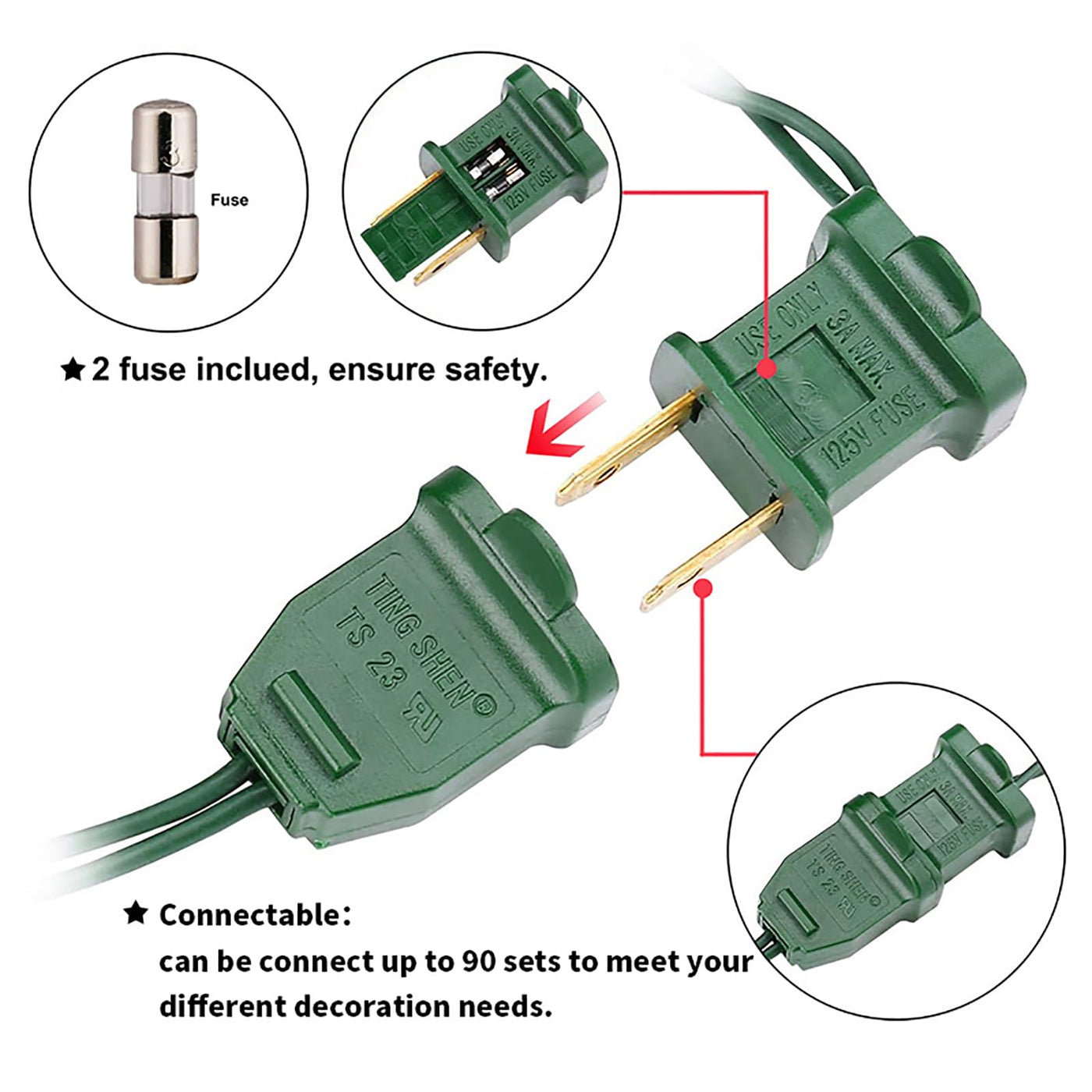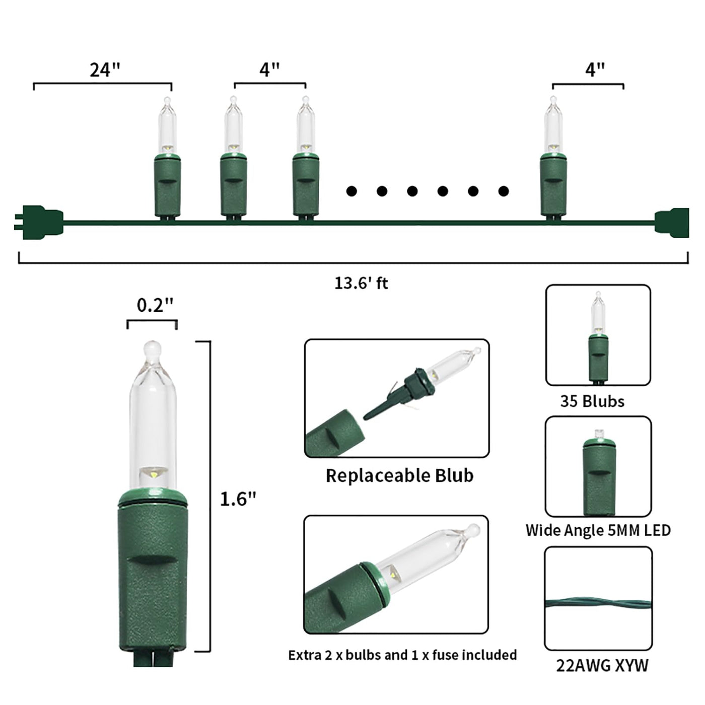 What's in the Box: - 35 LED Green Wire Warm White Mini String Lights for Christmas Decorations - 2 x Extra LED Bulbs - 1 x Extra Fuse - 1 x User Manual / Product Description