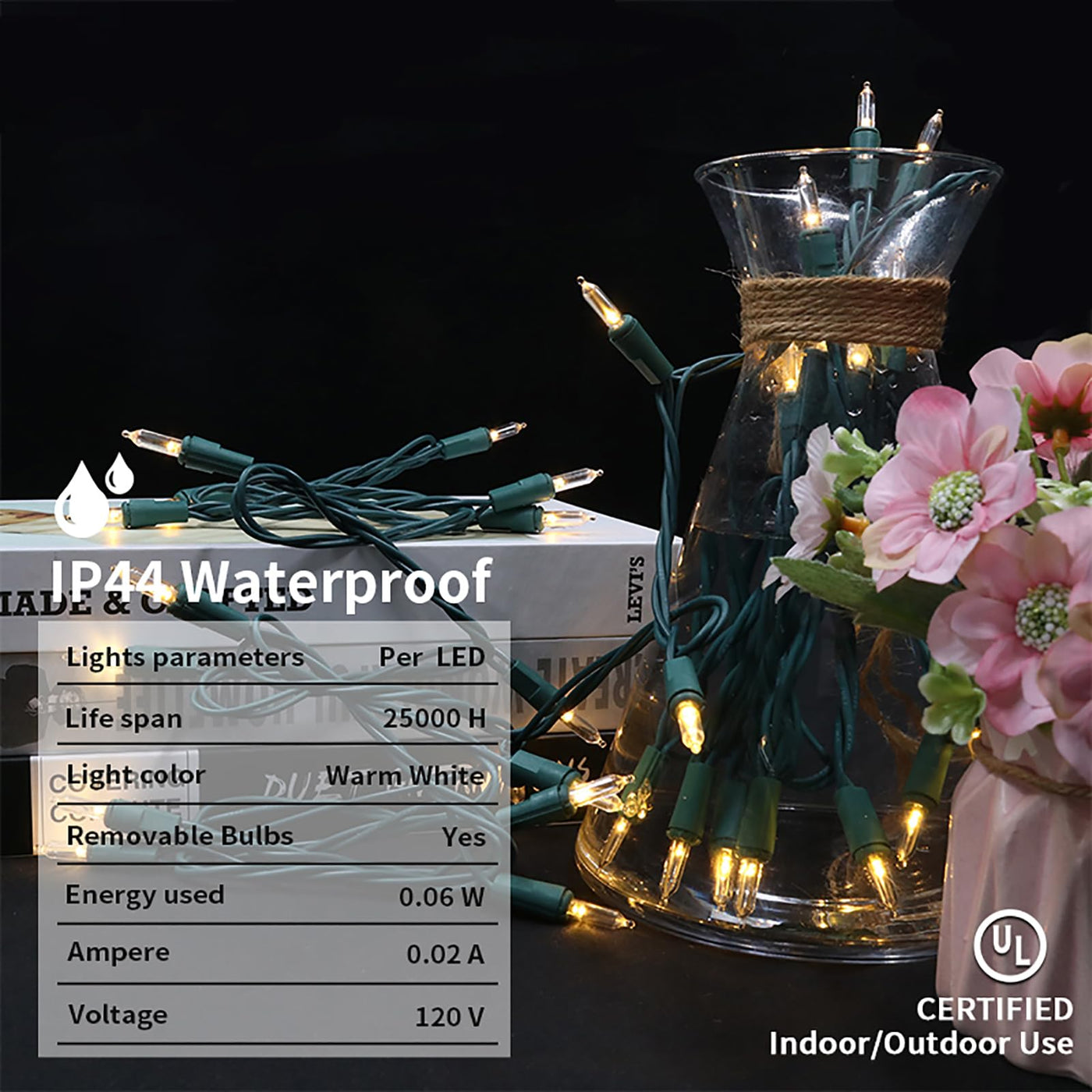 Specifications: - LED Light Color: Warm White - Light Display: Steady - Bulb Type: LED - Bulb Shape: Wide Angle 5mm - Removable Bulbs: Yes - Fire Resistance Rating: Class A 105? - Ingress Protection Rating: IP44 - Usage: Indoor / Outdoor