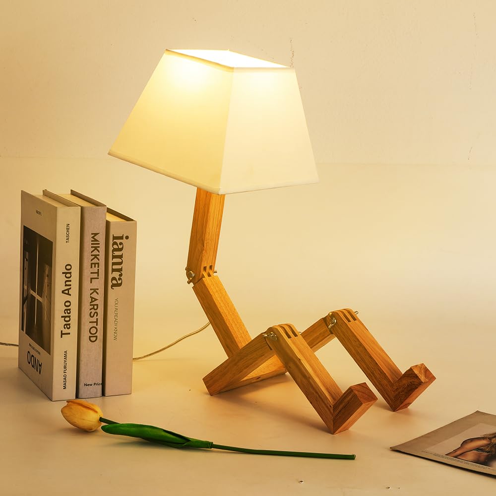 Mumeng Cute Desk Lamp, Dimmable Robot Table Lamps, Wood Bedside Lamps Nightstand Lamp For Bedroom, Study, Office, Living Room