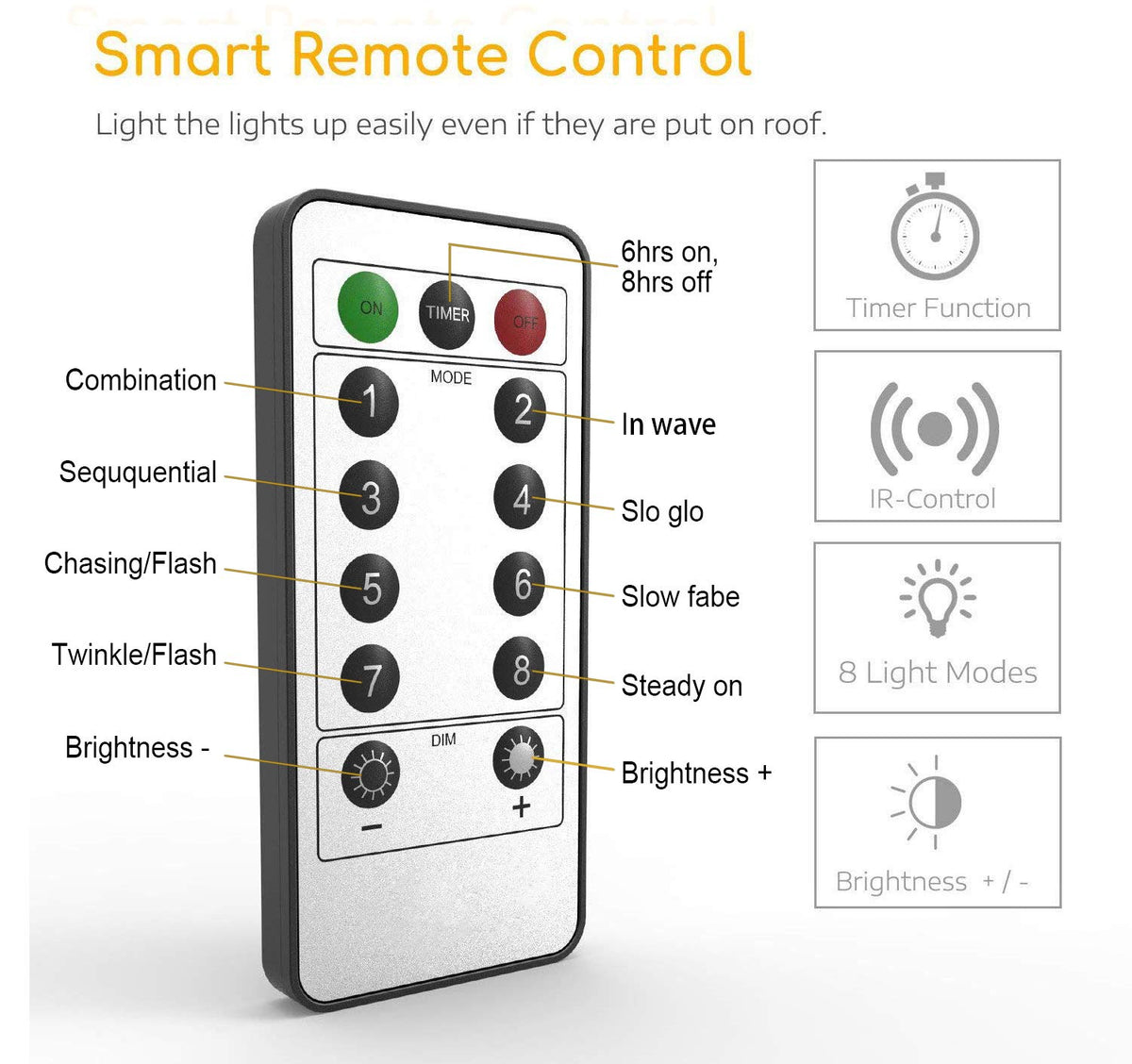 Q: What are the different lighting modes available with these string lights?A: The fairy lights feature 8 different dynamic and static lighting modes, including twinkle and steady on, which can be easily adjusted using the remote control.